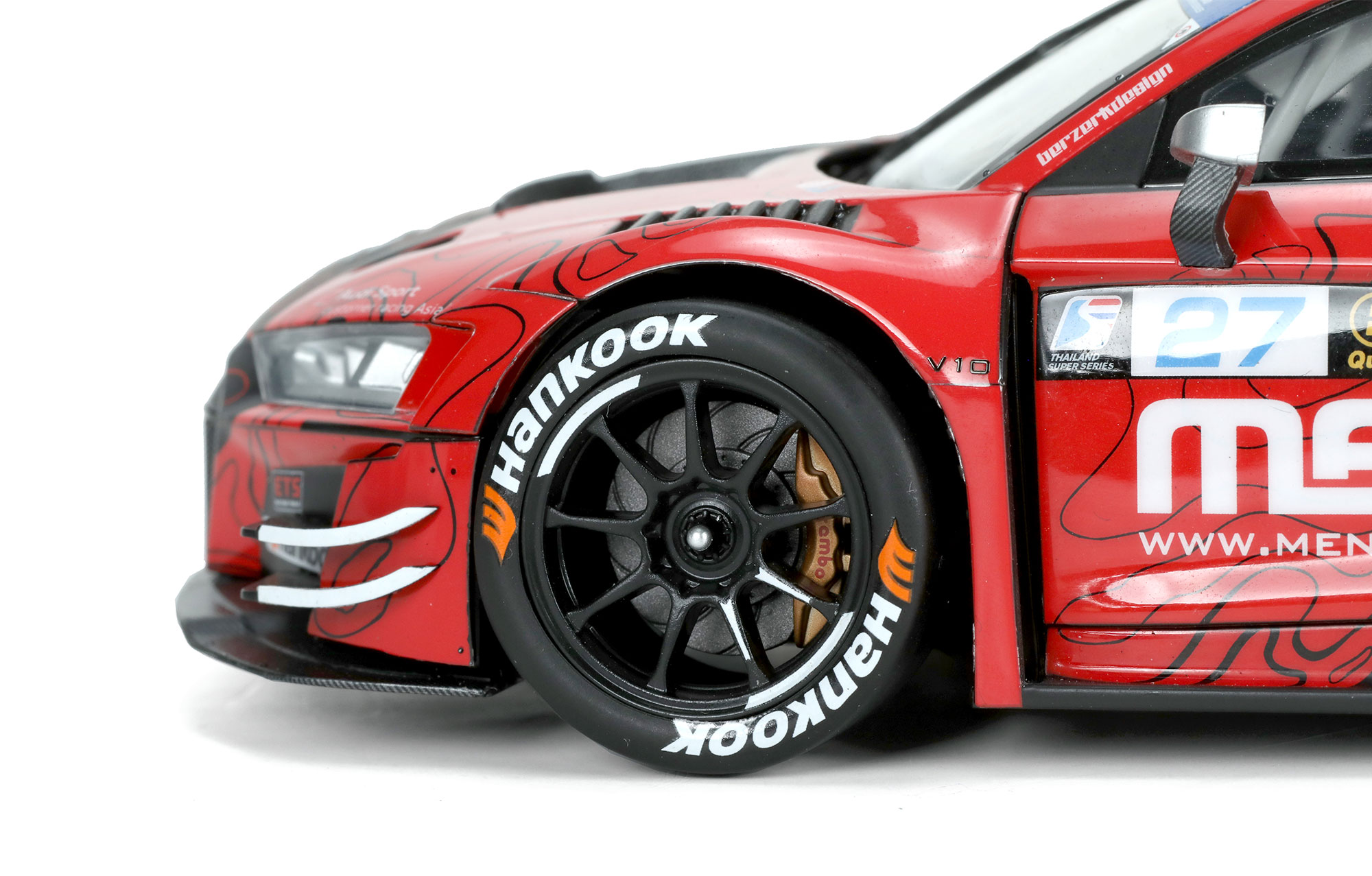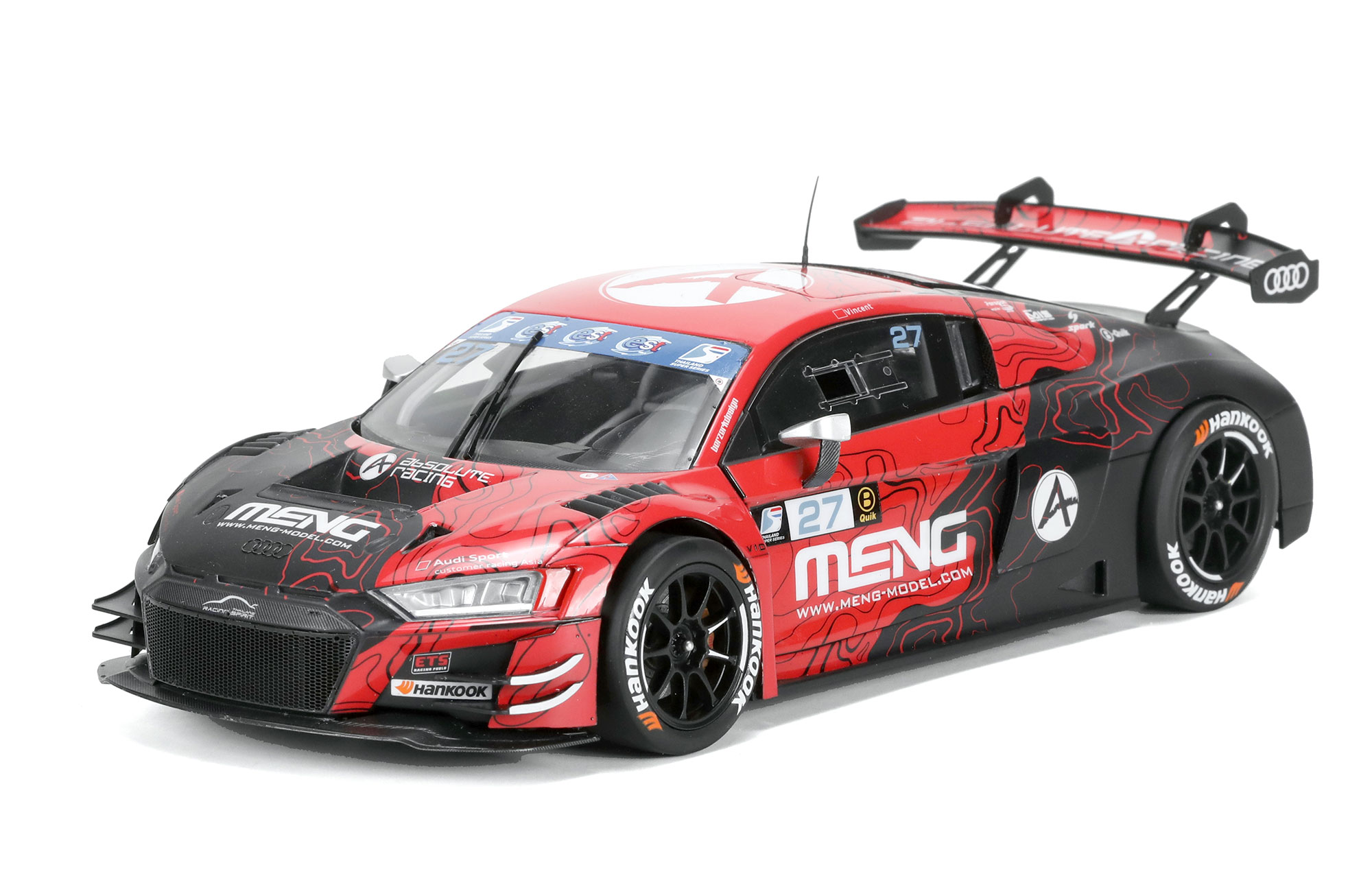 CS-009奥迪R8 LMS GT3 Evo II是MENG与奥迪联合推出的1/24拼装模型套件。该套件完成后,车长190毫米,宽51毫米,高83毫米。模型将Evo II全新设计的尾翼及其他升级组件忠实再现;提供可拆卸的透明发动机舱盖零件;车门可活动开合;前轮可转向;所有车灯均为透明零件。套件包含精密蚀刻片、采用织物材料制作的安全带、预裁切遮盖贴纸、用于后视镜及车标的金属贴纸。