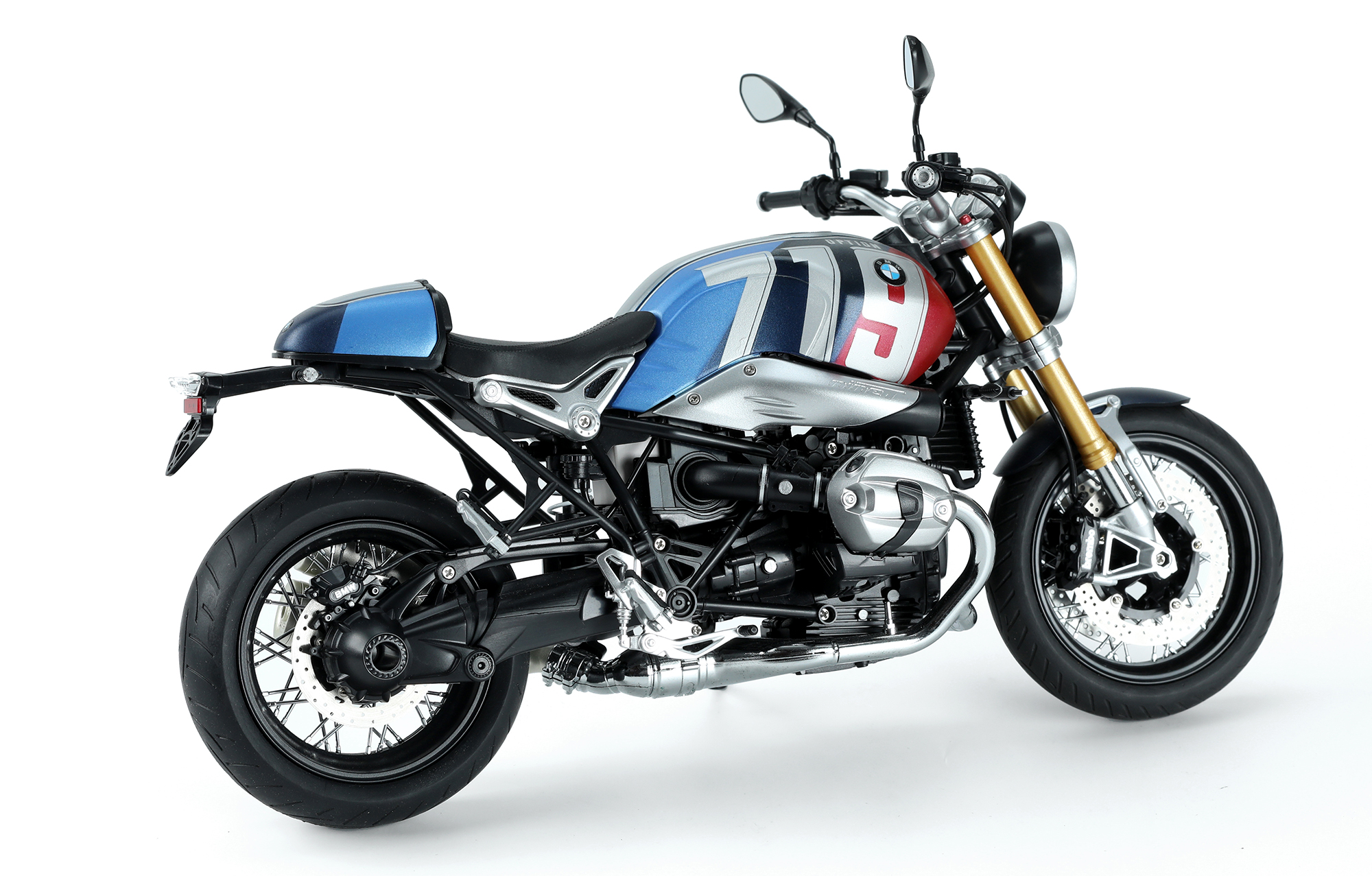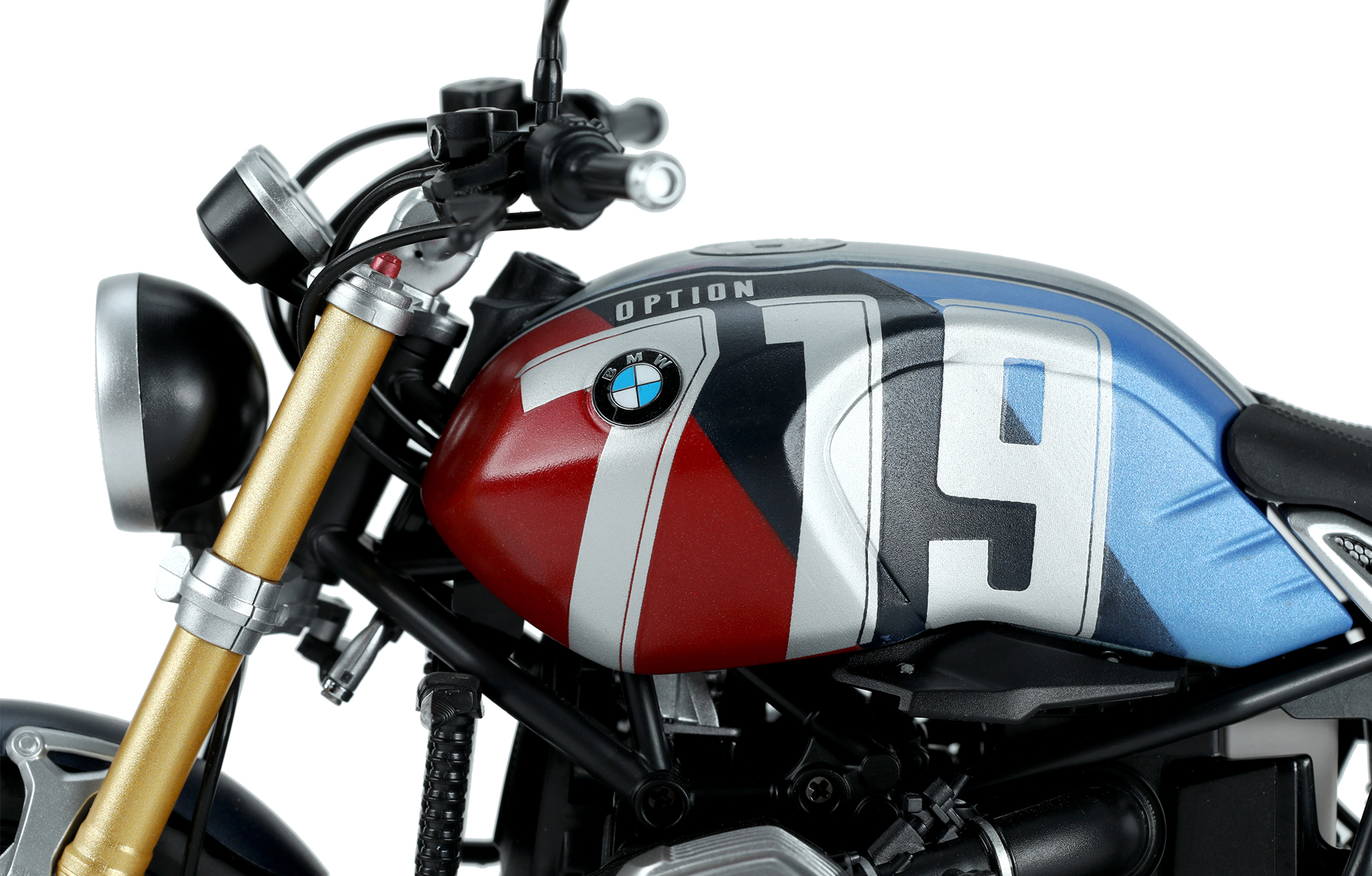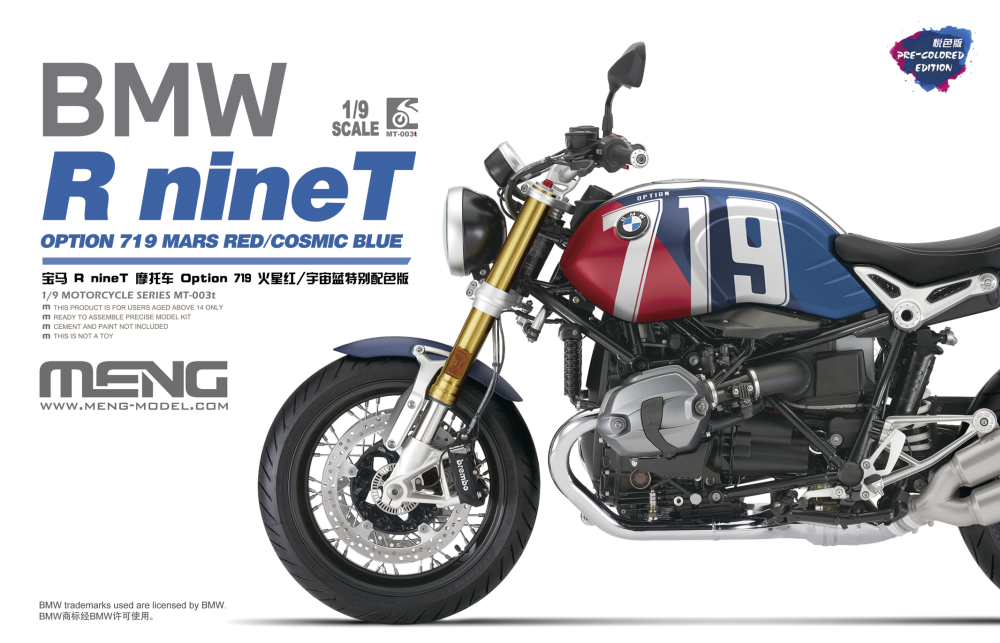 MT-003t宝马R nineT Option 719 火星红/宇宙蓝特别配色版是MENG与BMW联合推出的1/9比例悦色版拼装模型套件。该套件完成后,车长236毫米,宽99毫米,高141毫米。悦色版拼装模型采用免胶预上色设计,只需组装,无需喷涂。模型的前后避震及方向阻尼器均可活动。模型的车轮辐条、大灯灯碗、排气管前段等零件采用电镀工艺。模型所有车灯均为透明零件。后视镜采用镜面贴纸。套件包含金属材质的油箱和驼峰;软胶材质的座椅和靠背;不锈钢蚀刻片和免上色蚀刻片。套件可选择制作单座型或双座型。