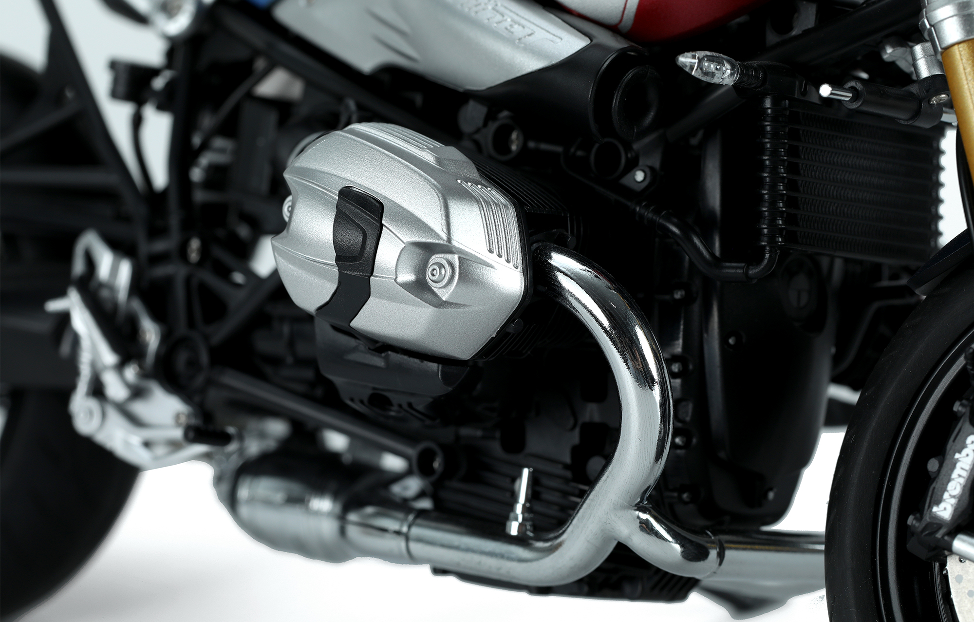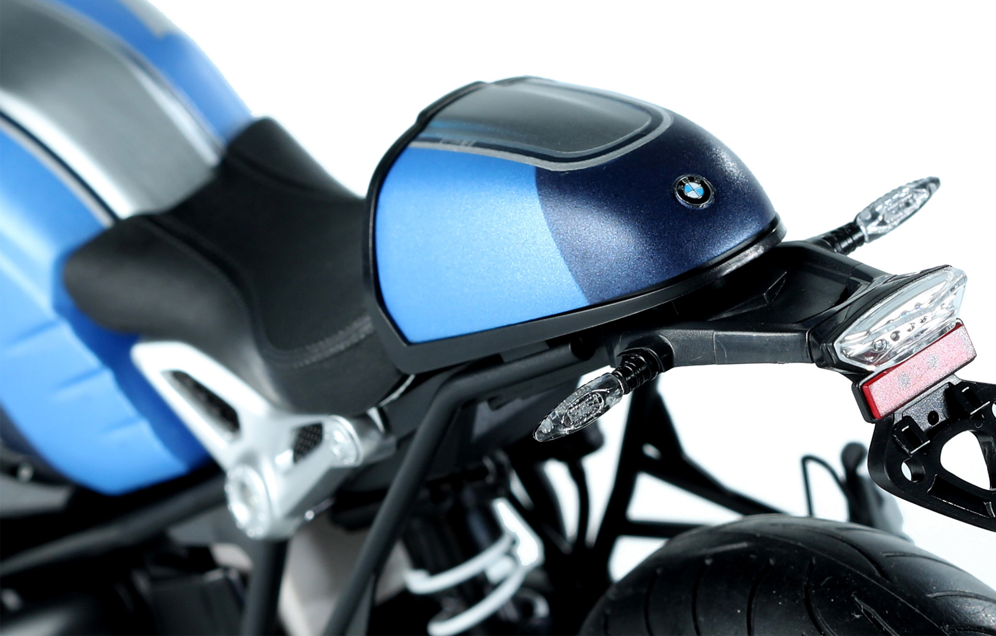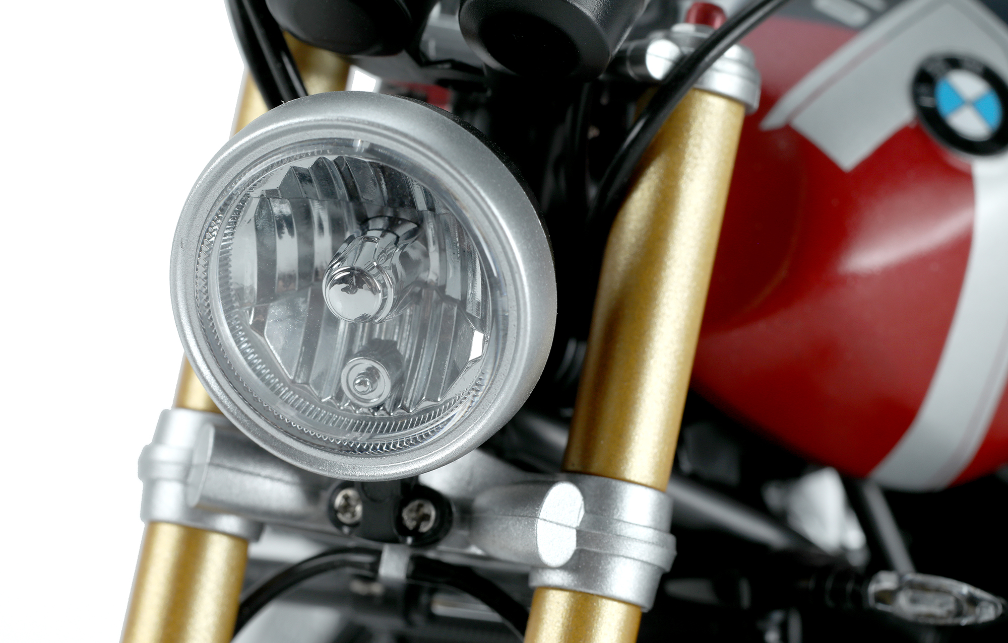 MT-003t宝马R nineT Option 719 火星红/宇宙蓝特别配色版是MENG与BMW联合推出的1/9比例悦色版拼装模型套件。该套件完成后,车长236毫米,宽99毫米,高141毫米。悦色版拼装模型采用免胶预上色设计,只需组装,无需喷涂。模型的前后避震及方向阻尼器均可活动。模型的车轮辐条、大灯灯碗、排气管前段等零件采用电镀工艺。模型所有车灯均为透明零件。后视镜采用镜面贴纸。套件包含金属材质的油箱和驼峰;软胶材质的座椅和靠背;不锈钢蚀刻片和免上色蚀刻片。套件可选择制作单座型或双座型。