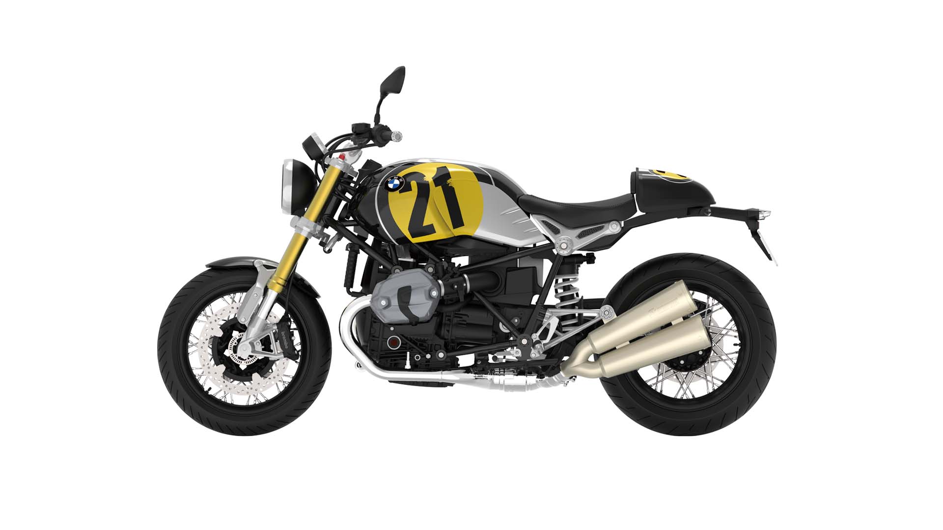 宝马R nineT是宝马摩托车成立90周年的纪念车型。它以café racer风格作为设计基础,将编织式钢管车架、双环式仪表盘、鳍片式发动机外壳等充满古典味道的元素继承下来。同时,它将运动性能、现代科技融入设计,包含水平对置双缸“拳击手”发动机、46mm倒立式前叉、第三代Paralever悬挂系统、Motorrad防抱死刹车系统等。除此之外,宝马R nineT还是一款允许高度“订制化”的产品,为车主提供丰富的选装配件。宝马R nineT是融合了古典与现代美学的典范之作,是宝马最成功的摩托车型之一。