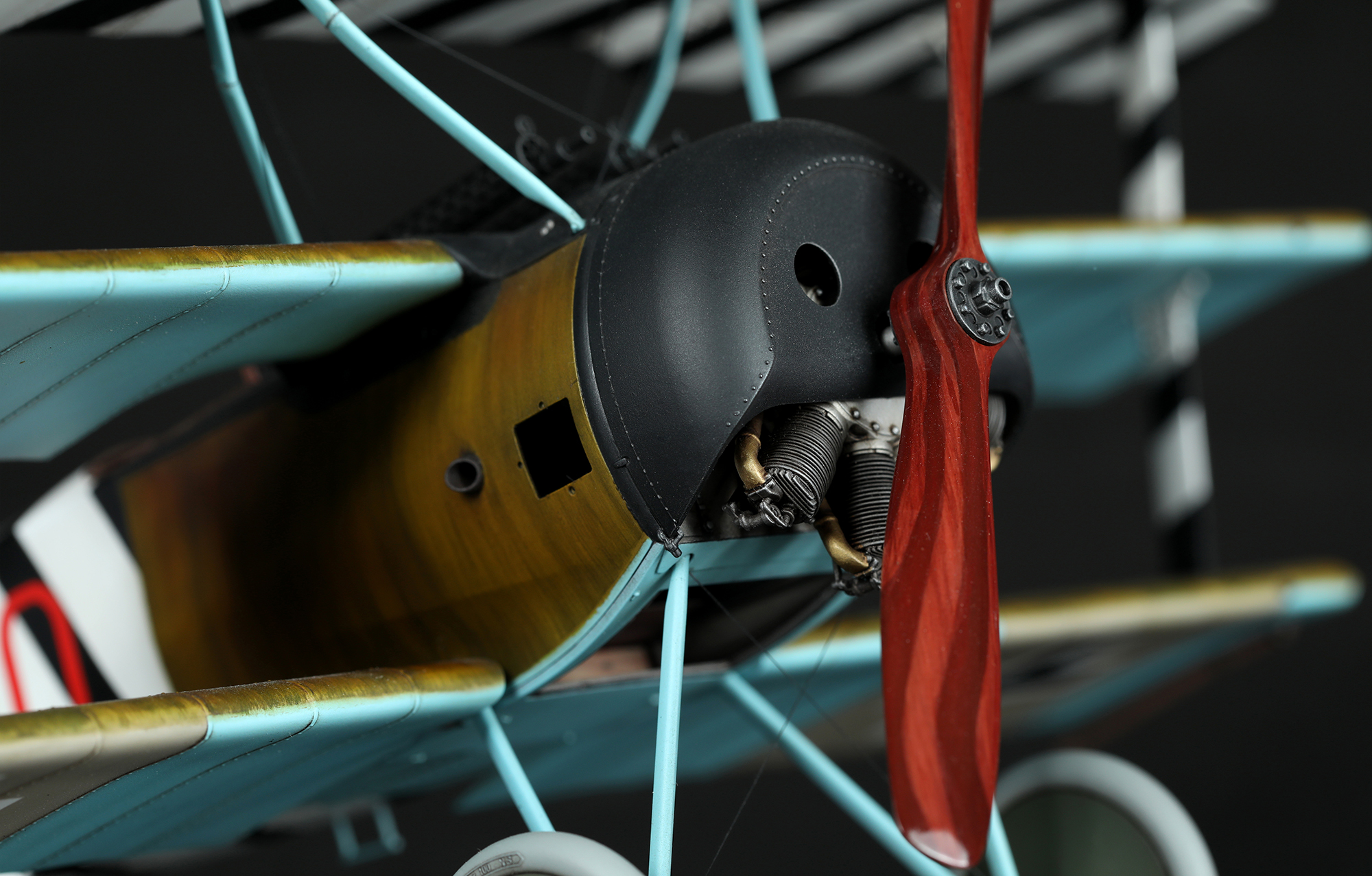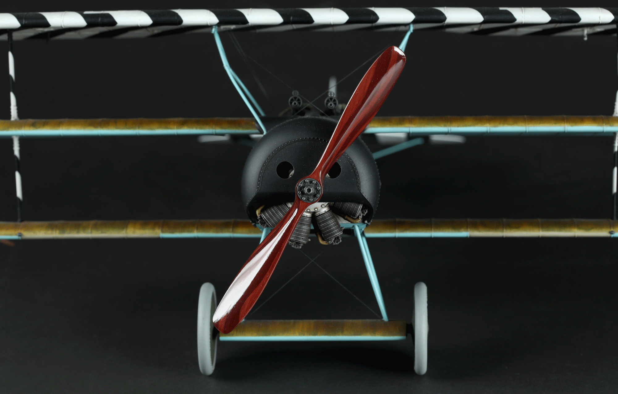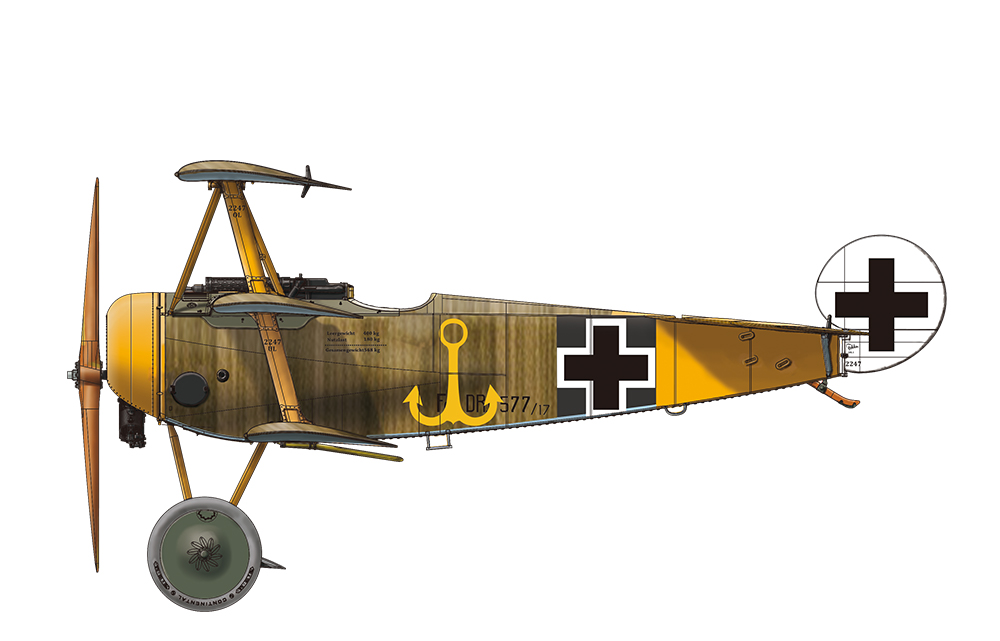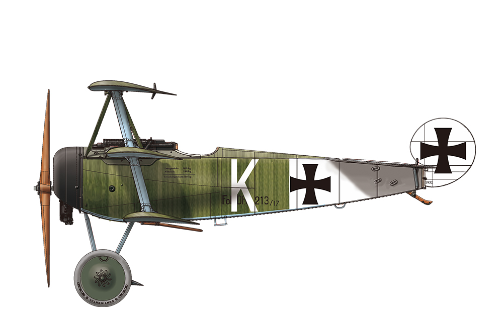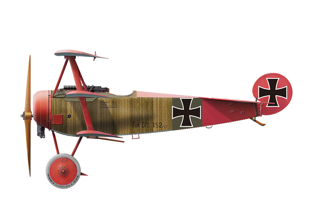 1917年8月,福克公司的Dr.I战斗机进入德军服役。Dr.I有三层主翼,比同时代的其他飞机可以产生更多升力,进而做出更灵活的飞行动作。Dr.I三层主翼的翼展由上至下依次收小,甚至在两个主起落架之前还有一块翼片,能够起到第四层机翼的作用。在Dr.I的座舱前方安装有两挺MG08风冷式航空机枪,其火力也远胜于英国的三翼战斗机。基于这些设计,Dr.I在福斯、里希特霍芬、乌德特等顶尖飞行员的手中取得了骄人战绩,在航空史和军事史上留下了浓墨重彩的一笔。