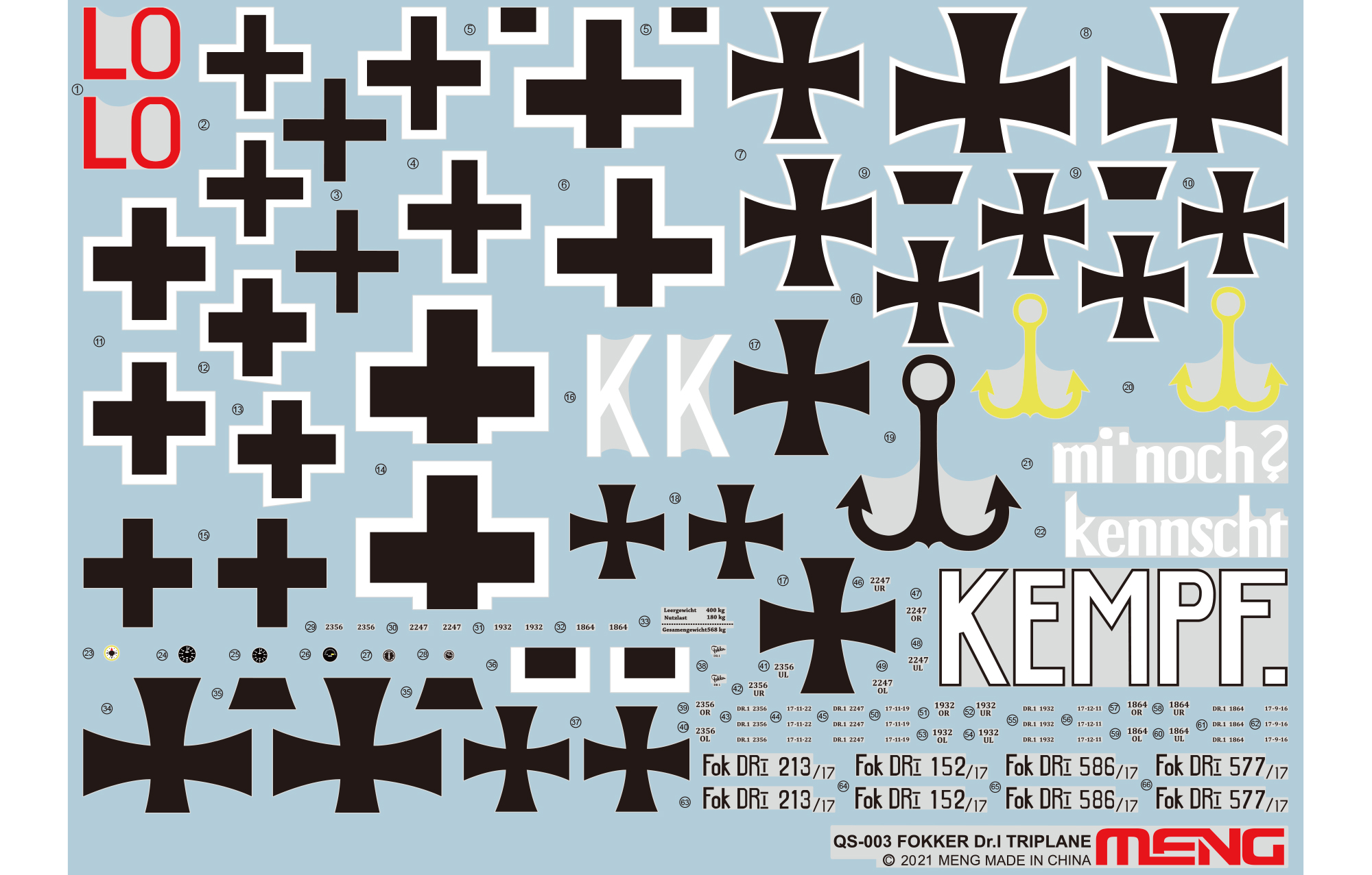 QS-003福克Dr.I战斗机是MENG推出的1/24大比例拼装模型套件。该套件完成后,翼展300毫米,全长243毫米。模型包含精密的座舱组件和发动机内构。运用数字雕刻技术将机翼的蒙布张力效果逼真呈现。运用特殊金属工艺将航空机枪热护套一体成型,逼真还原航空机枪的精密构造。座椅安全带采用特殊柔性材料,观感、触感均精美还原。套件包含精密蚀刻片,并提供四种涂装选择。