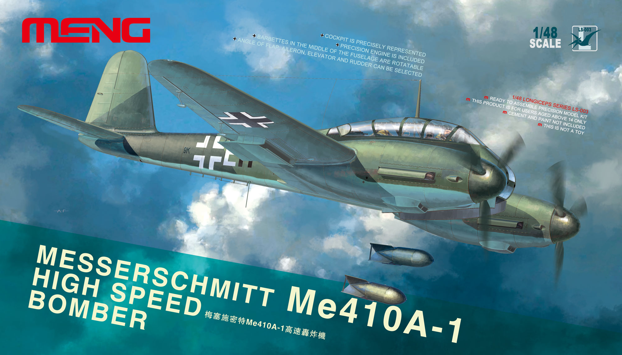 Me410A-1高速轰炸机1:48塑料比例拼装模型,全长263mm,宽340mm。模型完美还原实机的优美线条;座舱细节丰富;发动机精密再现;机身中部机枪炮塔旋转可动;襟翼、副翼、升降舵、方向舵安装角度可以自由选择;发动机散热器可以选择打开或者关闭状态;附带两种不同的炸弹。套件包含两种涂装方案。