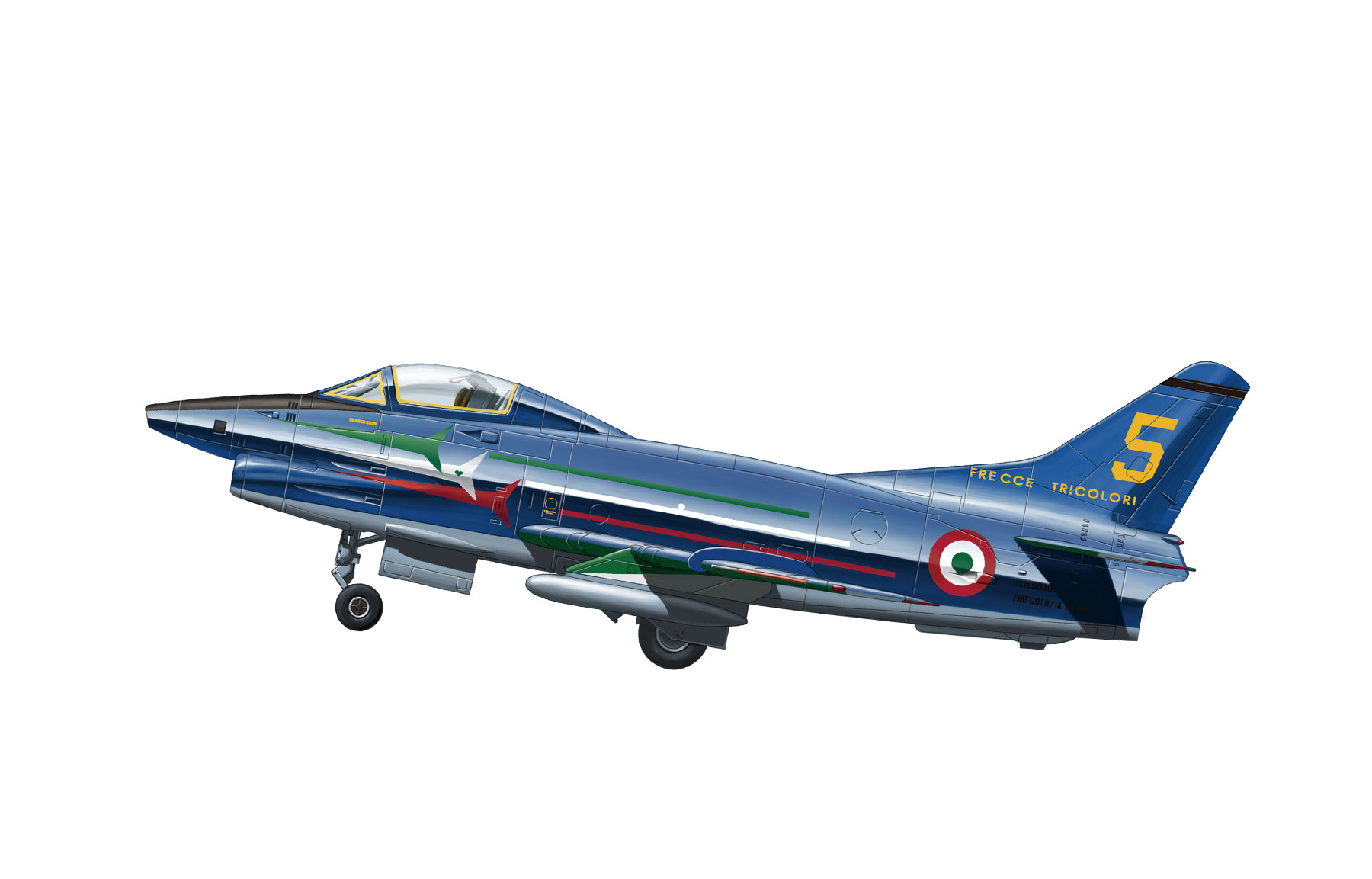G.91R 轻型战斗轰炸机1/72比例塑胶拼装模型。全长:143mm,翼展:118mm。套件提供两种亚型选择:R/1与R/3;起落架、座舱盖、减速板均可选择开闭两种状态;三种火箭发射巢和一种炸弹供挂载选择;包括“三色箭”飞行表演队式样在内的三种涂装可供选择;在最初发售的套件中附赠意大利“三色箭”飞行表演队PVC徽章魔术贴一枚。