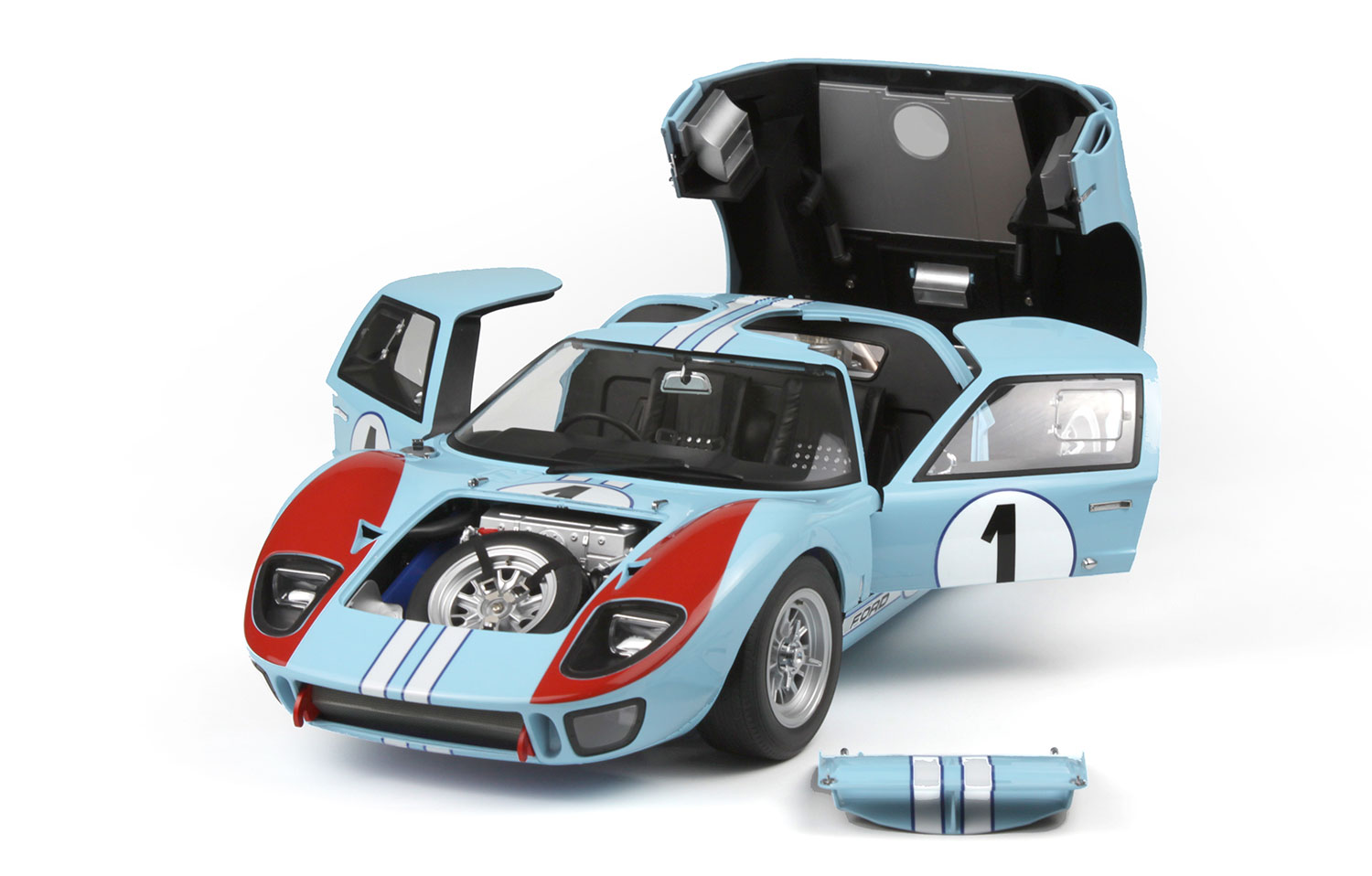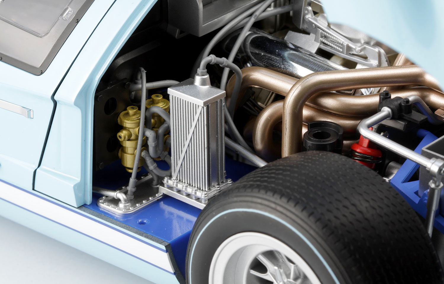 RS-001福特GT40 Mk.II’66为MENG与福特汽车公司联合推出的1/12大比例高精度悦色版拼装模型套件。该套件完成后,车长347毫米,高90毫米。悦色版拼装模型采用免胶预上色设计,只需组装,无需喷涂。模型包含完整的悬挂系统、动力系统、驾驶舱及前备箱内构,多种材质零件诠释精密细节。模型同时具有极高的可动性,车门、前备箱盖及发动机盖可打开、车轮与悬挂系统可活动、方向盘与前轮可联动。