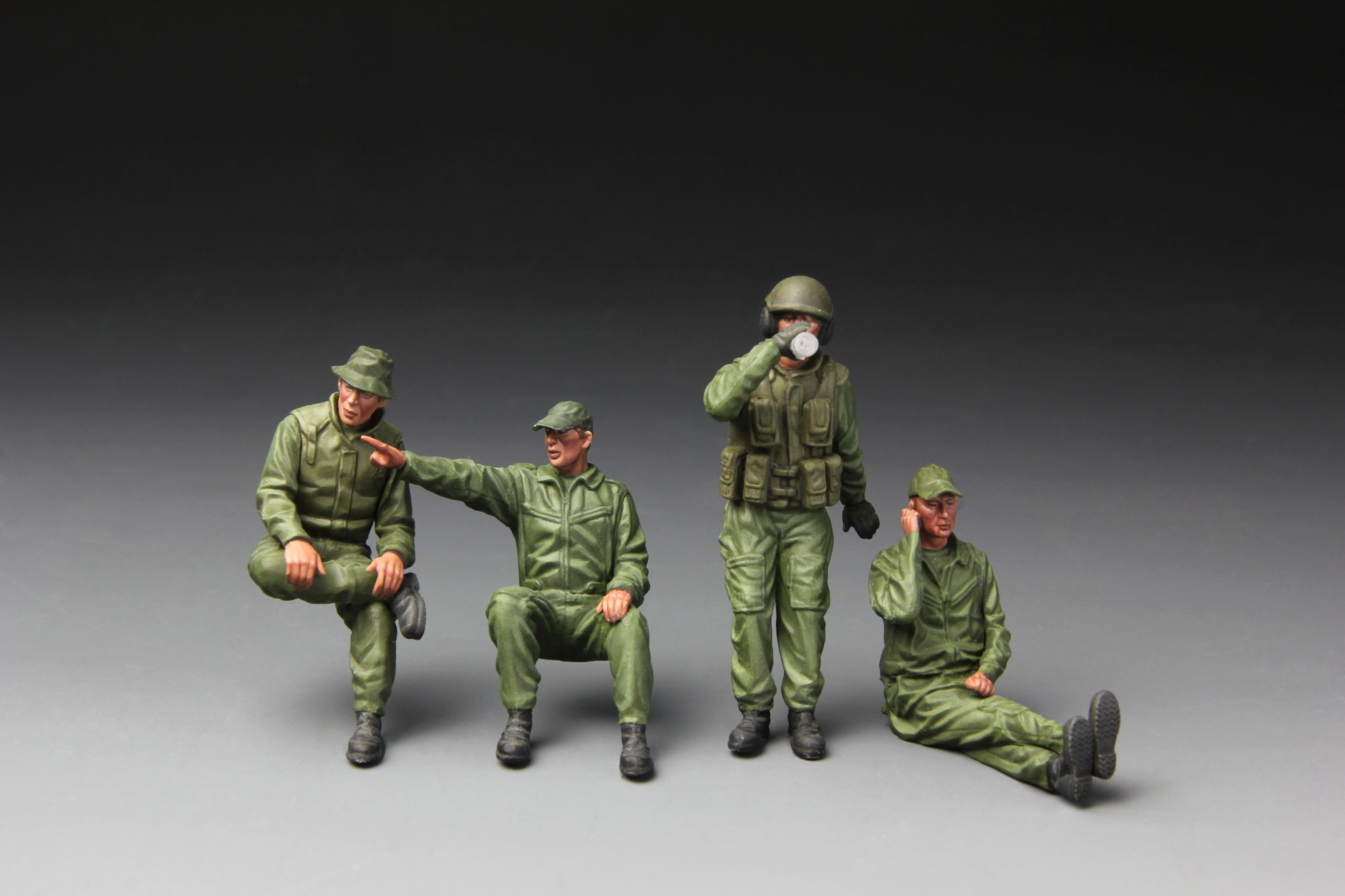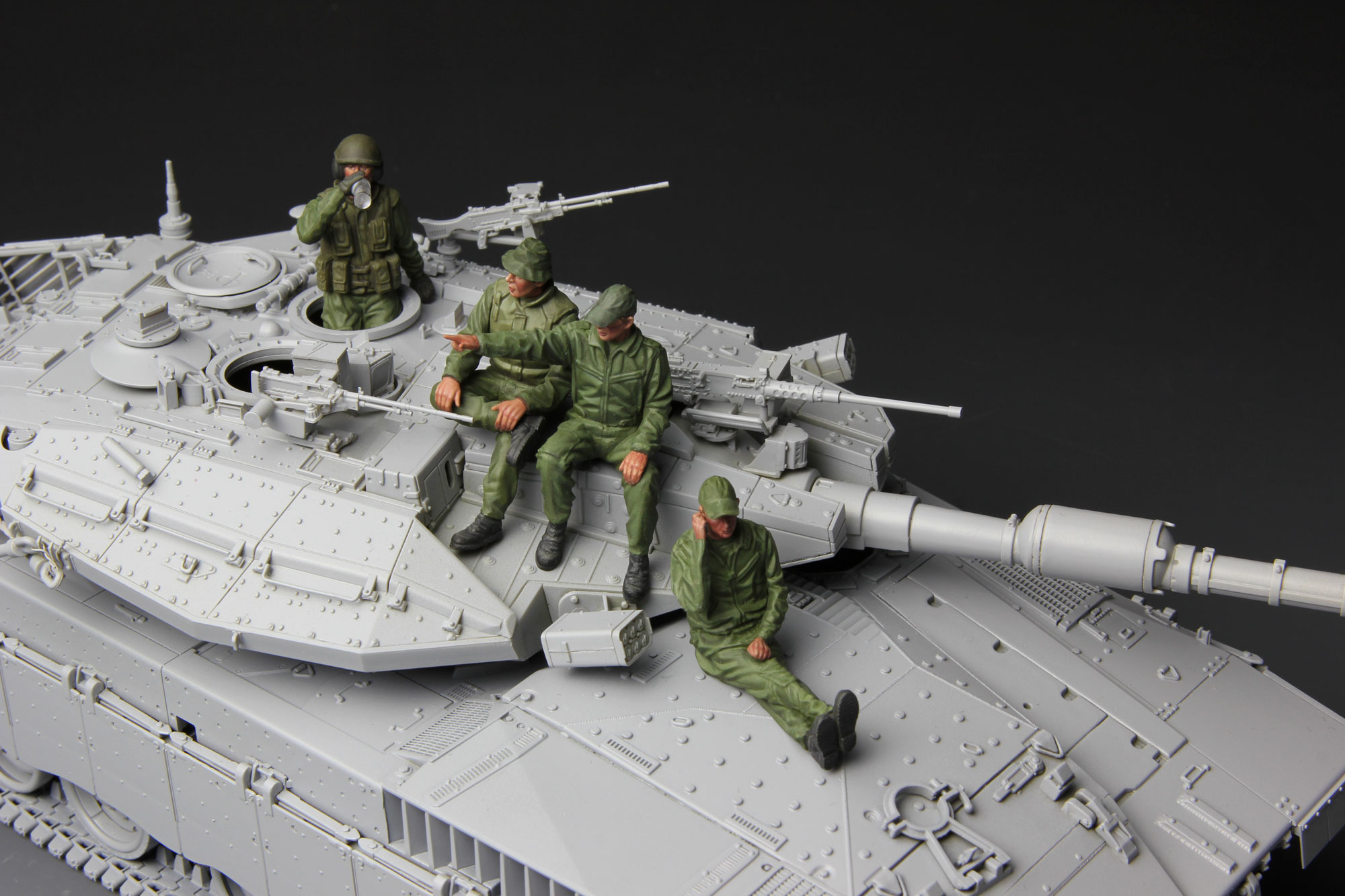 套件可以组装出以色列国防军4个形态各异、呈休息状态的坦克乘员。他们的面部刻画生动、动作自然舒展、着装考证严谨,可以搭配同比例所有的以色列国防军现代战车模型。感谢西班牙著名的人物模型师Juan Antonio Perez Marchante为此特别创作的涂装完成品。