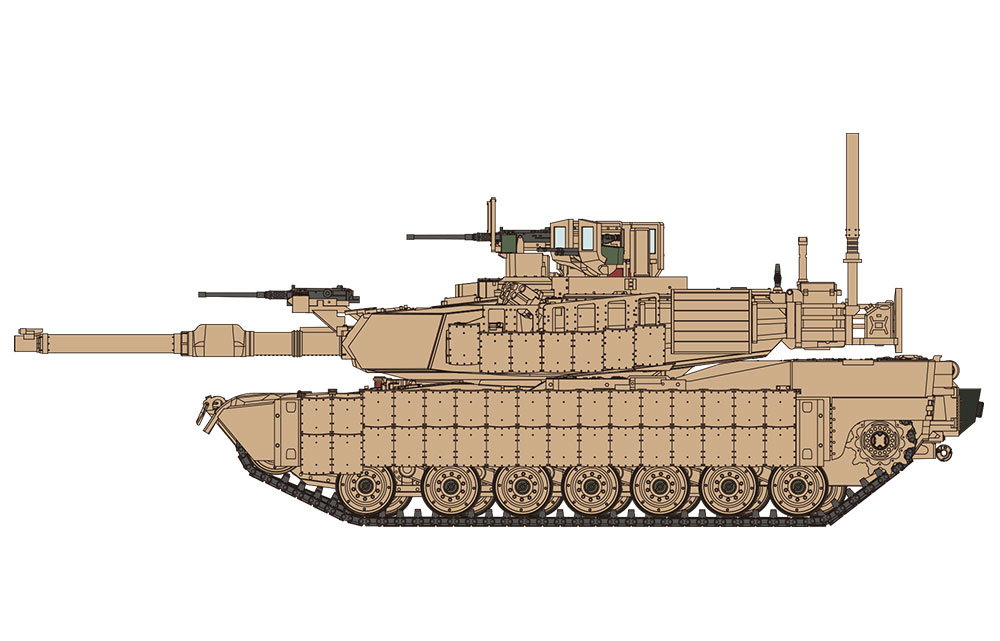 M1A2 SEP“艾布拉姆斯”TUSK II主战坦克是美国陆军为应对城市作战,在M1A2主战坦克基础上进行改进的升级型号。其用于城市战的坦克城市生存套件(Tank Urban Survival Kit TUSK)外观最大特征就是遍布车身的反应装甲和舱门外的防弹玻璃,能够有效保护相对脆弱的侧面装甲和探身车外的乘员,除此之外还增加了底盘装甲以应对地雷的威胁。得益于优秀的生存能力和先进的技术性能,M1A2 SEP“艾布拉姆斯”TUSK II在战场上占尽上风。