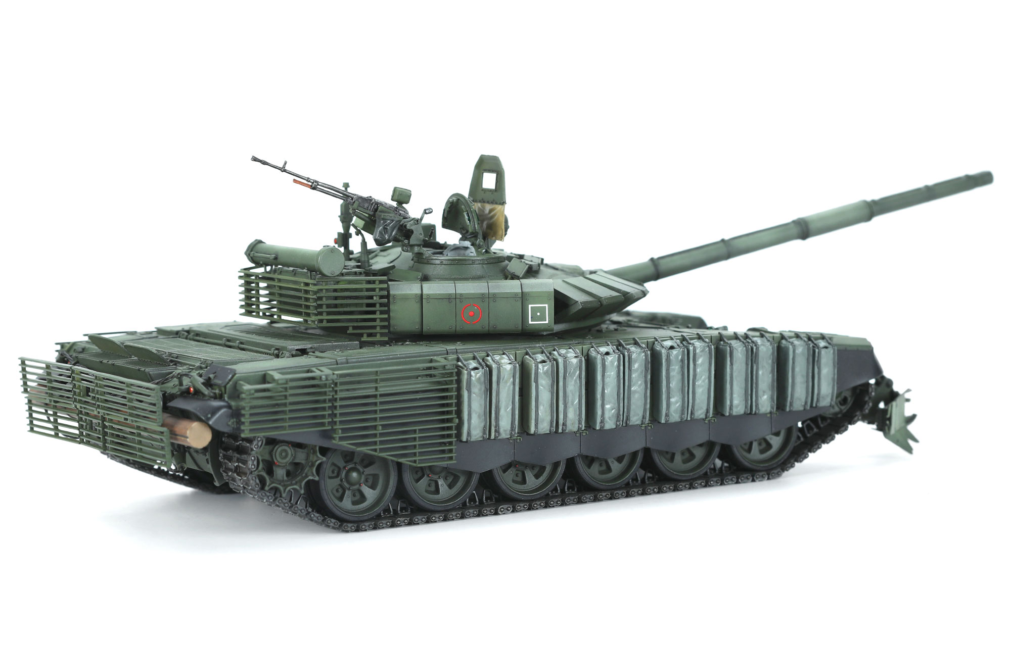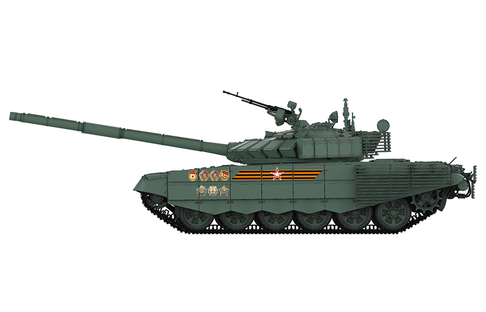 TS-053俄罗斯T-72B3M主战坦克带KMT-8扫雷系统是MENG与"Gur Khan Books" 出版社合作推出的1/35拼装模型套件。该套件完成后,全长280毫米,宽113毫米,高87毫米。模型忠实还原实车外型,将4S23“化石”爆炸反应装甲和格栅装甲精密呈现。使用数字雕刻技术还原炮盾防雨布及4S22软包爆炸反应装甲。模型包含仿真可动的扭杆悬挂系统和全新开模的便于制作的双销活动履带。所有乘员舱盖均可以活动,车灯、观察窗及瞄准用光学仪器均采用透明零件,同时附带KMT-8扫雷系统和精密金属蚀刻片。套件提供三种涂装方案。