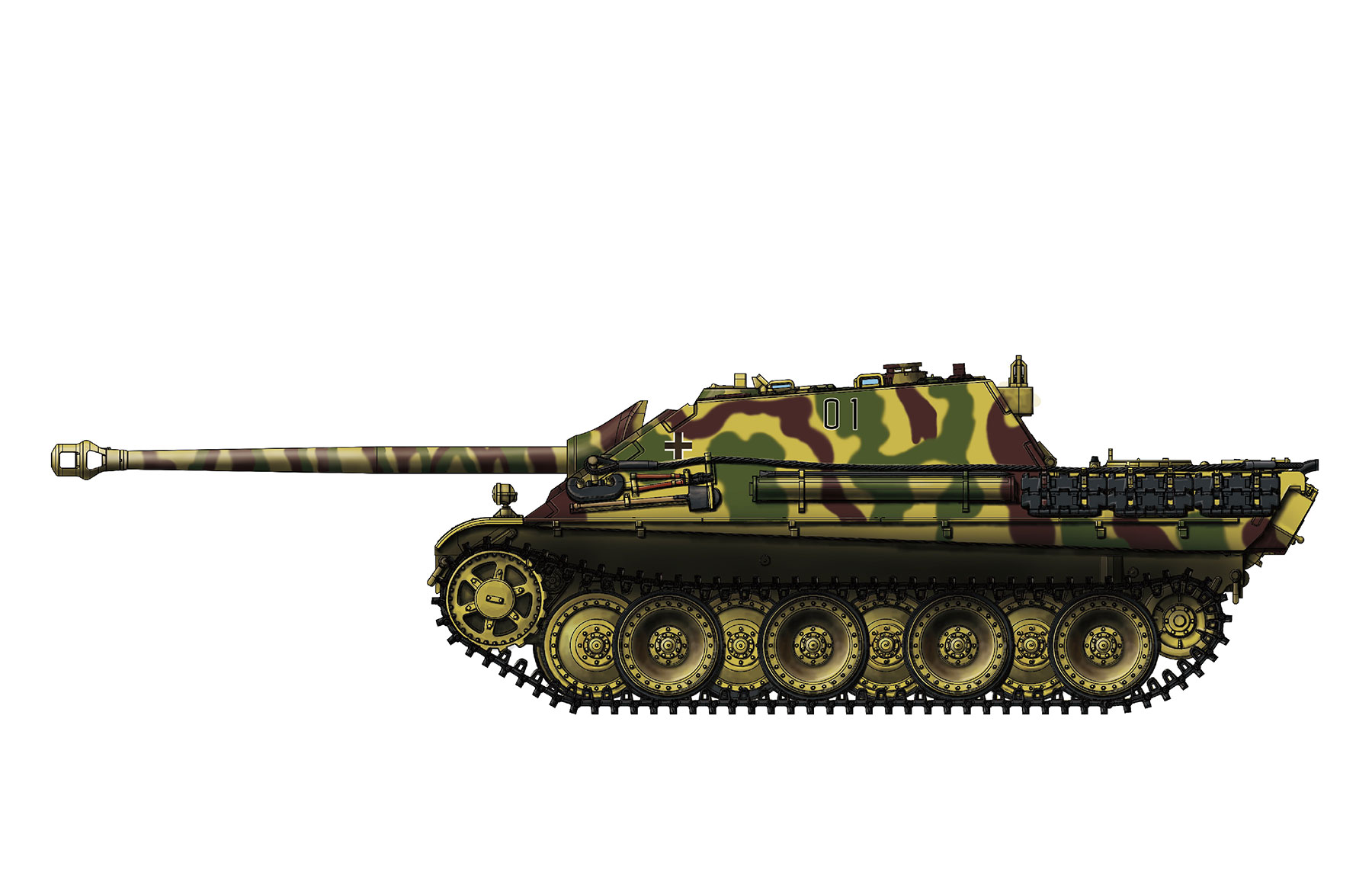 “猎豹”重型坦克歼击车,德文名称JAGDPANTHER。与更著名的三号突击炮不同,“猎豹”并非直接在“黑豹”坦克的底盘上修改战斗室而来,而是一款很早就做出规划,与“黑豹”共享大量零件的坦克歼击车。因此“猎豹”的一些特征的改变,并不与“黑豹”同步。这款坦克歼击车的核心,是一门8.8cm Pak 43 L/71反坦克炮,这门身管长度71倍径的重型反坦克炮与“虎王”装备的8.8cm KwK 43只有细节上的区别,威力惊人。“猎豹”本身的防护能力同样十分出色,车体正面是倾斜布置的80mm装甲,防弹水平优于“虎”I坦克的正面装甲;侧面同样倾斜布置的50mm装甲,在二战主战装备中也名列前茅。“猎豹”的动力系统则与“黑豹”坦克完全一致,有着出色的机动性。“猎豹”1944年2月开始交付,共生产了一年半的时间,在盟军的空袭下仅仅有400余辆车开下生产线,其中大部分都是“猎豹”G1型。