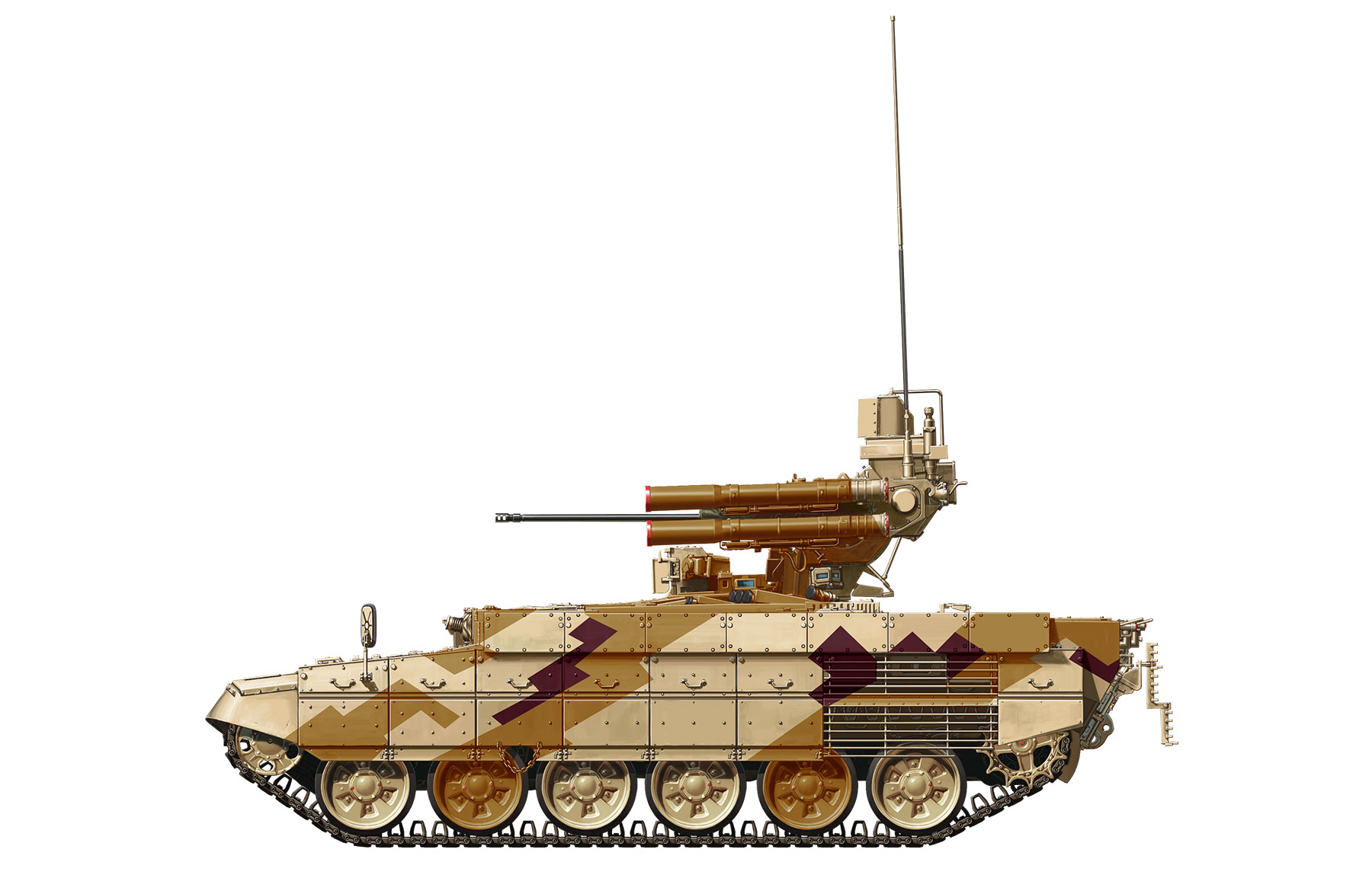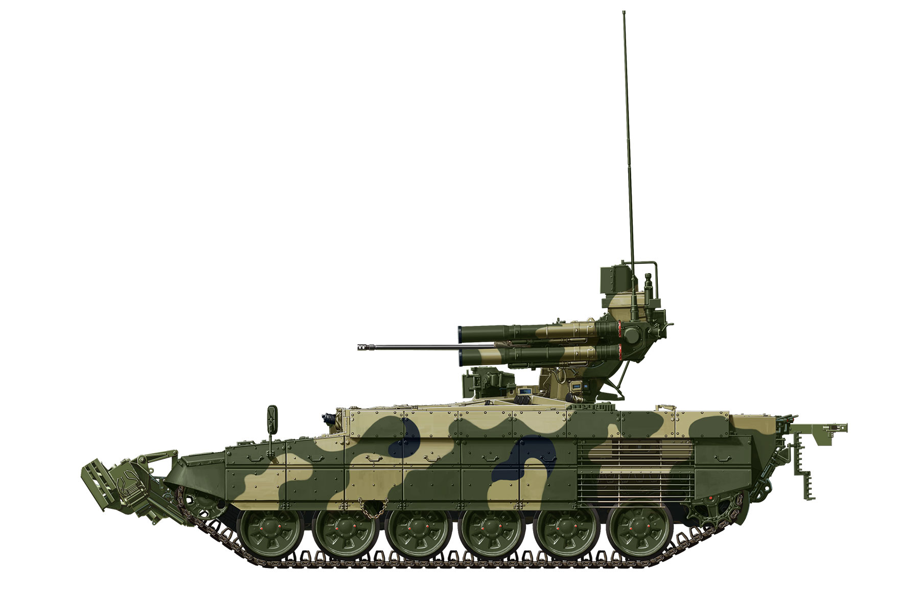 俄罗斯BMPT“终结者”火力支援战车是一款多用途、高机动性的履带式战车。它使用T-90A的底盘,炮塔上装有30mm口径自动火炮、7.62mm口径机枪和反坦克导弹系统,车体前部两侧翼子板上还装有30mm口径榴弹发射器;车体前部和两侧均装有爆炸反应装甲;乘员5人。可与任何一种坦克在不同地理条件下协同作战,在城市战中优势尤为突出。
