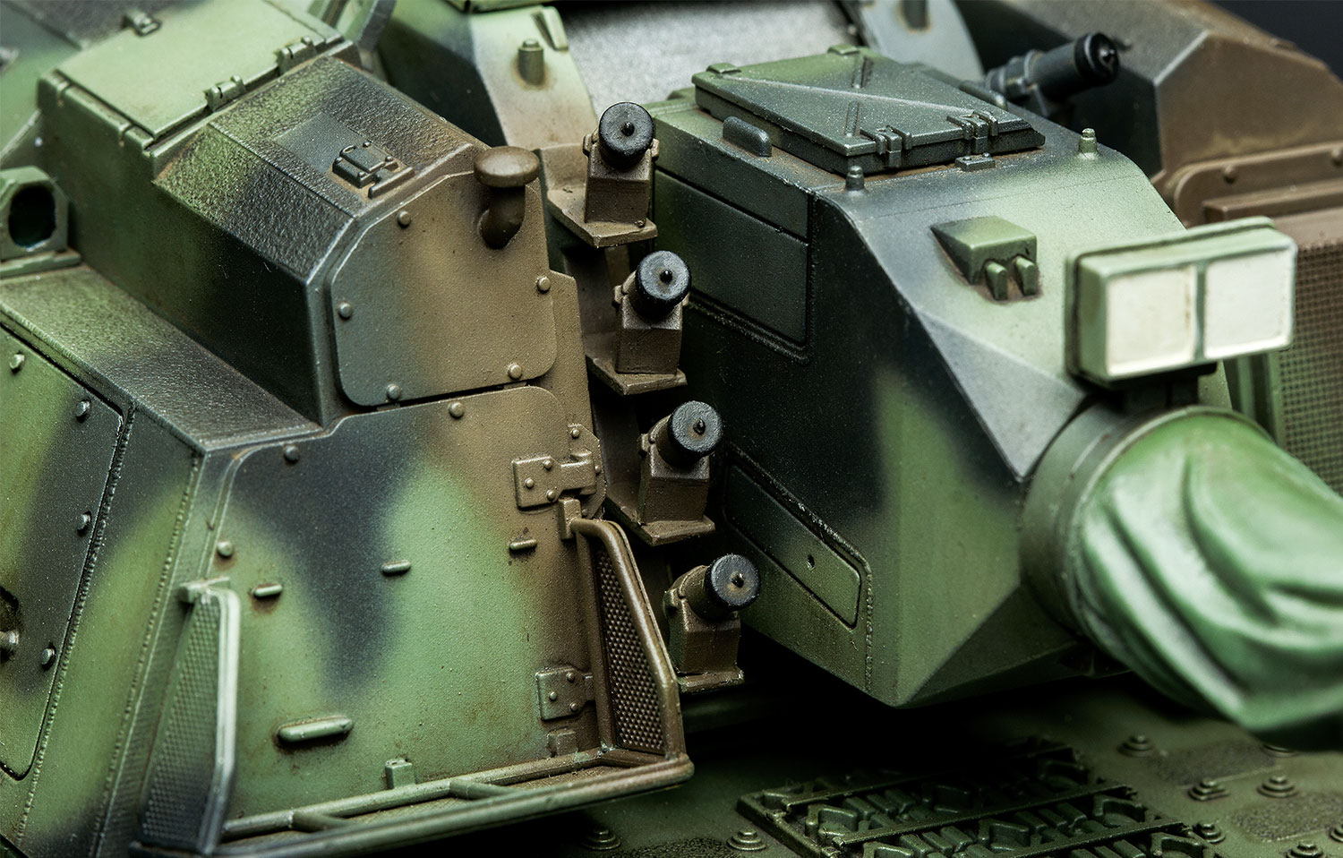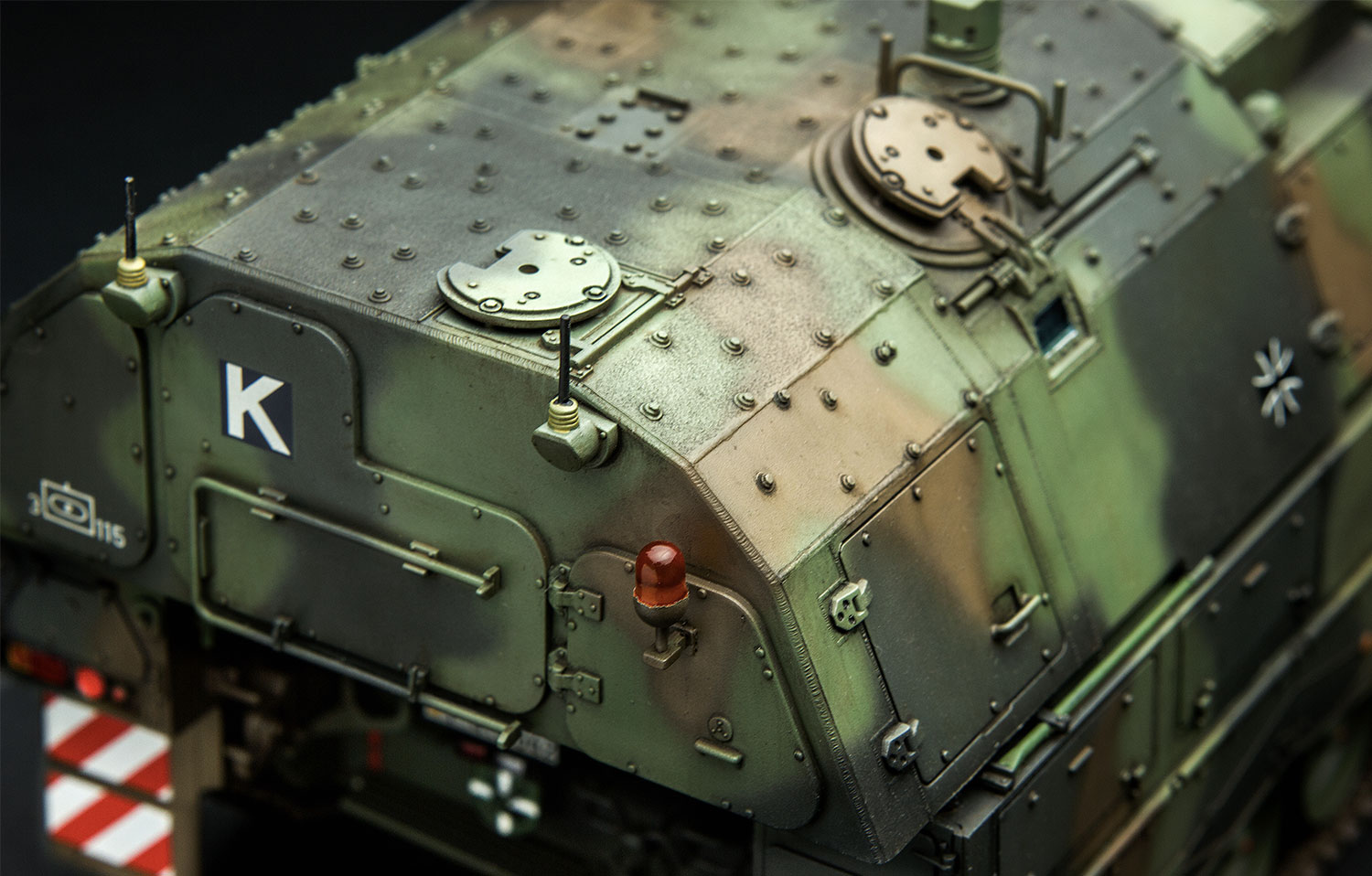 1/35比例德国Panzerhaubitze 2000自行榴弹炮塑胶拼装模型,长339mm,宽102mm。模型真实还原实车外形,驾驶员及乘员舱门可选择打开或关闭状态;悬挂系统完美复原且真实可动,免胶活动履带制作简单;附精密蚀刻片及金属炮管;五种涂装可供选择。