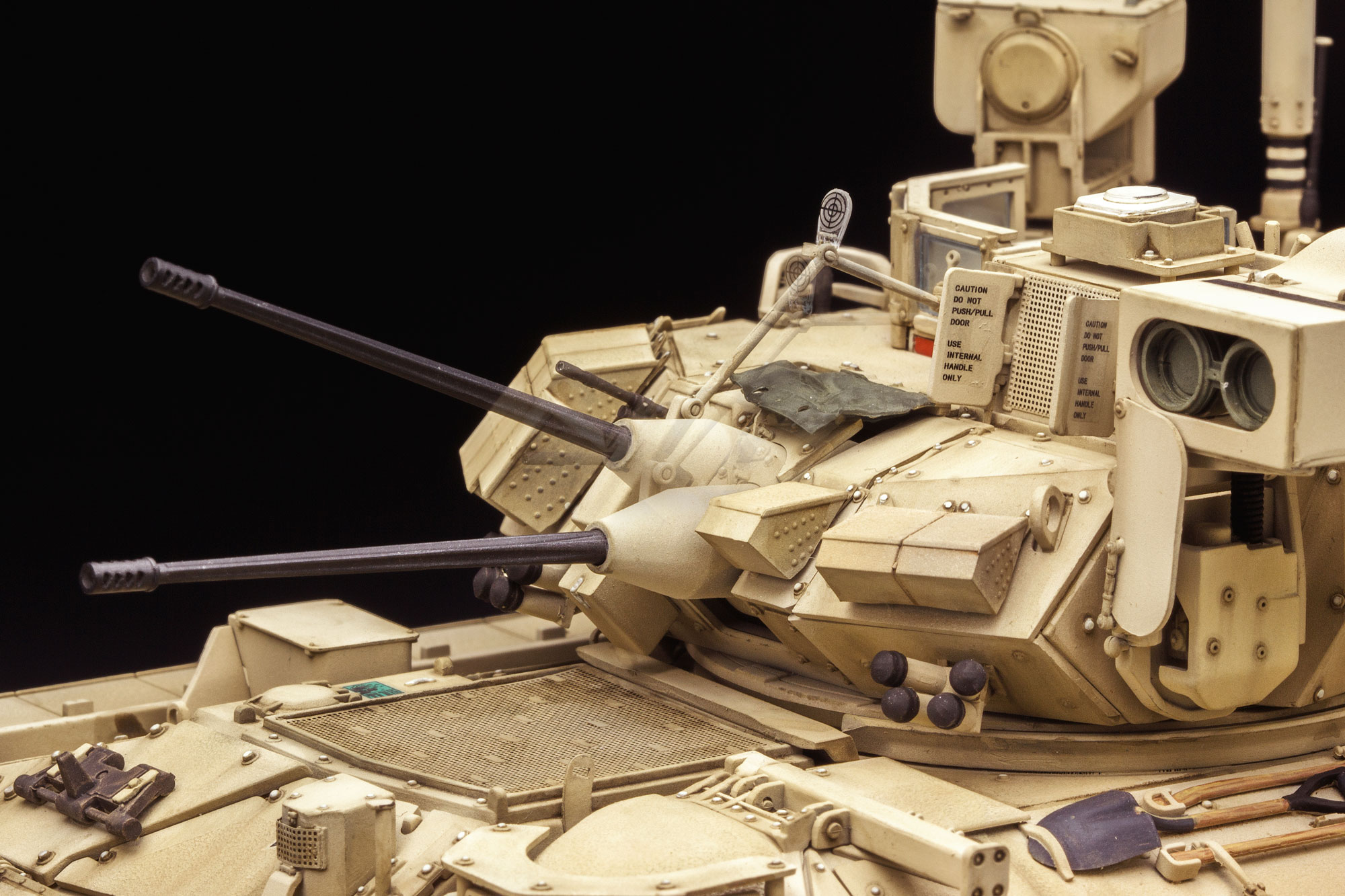 1/35比例美国M3A3“布雷德利”BUSK III 骑兵战车塑胶拼装模型,长203.5mm,宽107.3mm,高97.1mm(至关闭状态车长热成像瞄准仪顶部)。模型外形准确、细节丰富,所有舱门均可活动;配备免胶活动履带、活动悬挂、并列机枪瞄准镜联动机构,精密还原了整车结构与细节。套件附带精密蚀刻片。