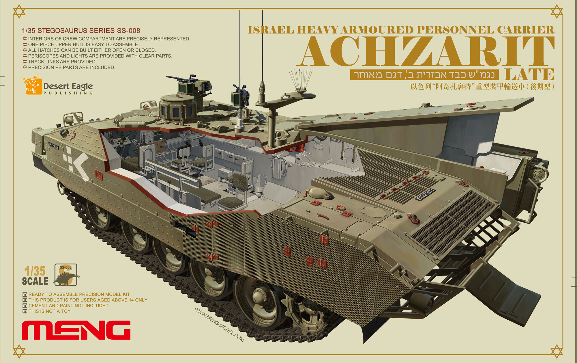 1/35比例以色列“阿奇扎里特”重型装甲输送车(后期型)塑料拼装模型,全长226mm,宽110mm。 模型精密还原后期型风貌,百夫长坦克路轮精准还原。载员舱内部完美再现,所有内部设备均如实呈现。套件附带精密蚀刻片以增加真实感,4种涂装可供选择。