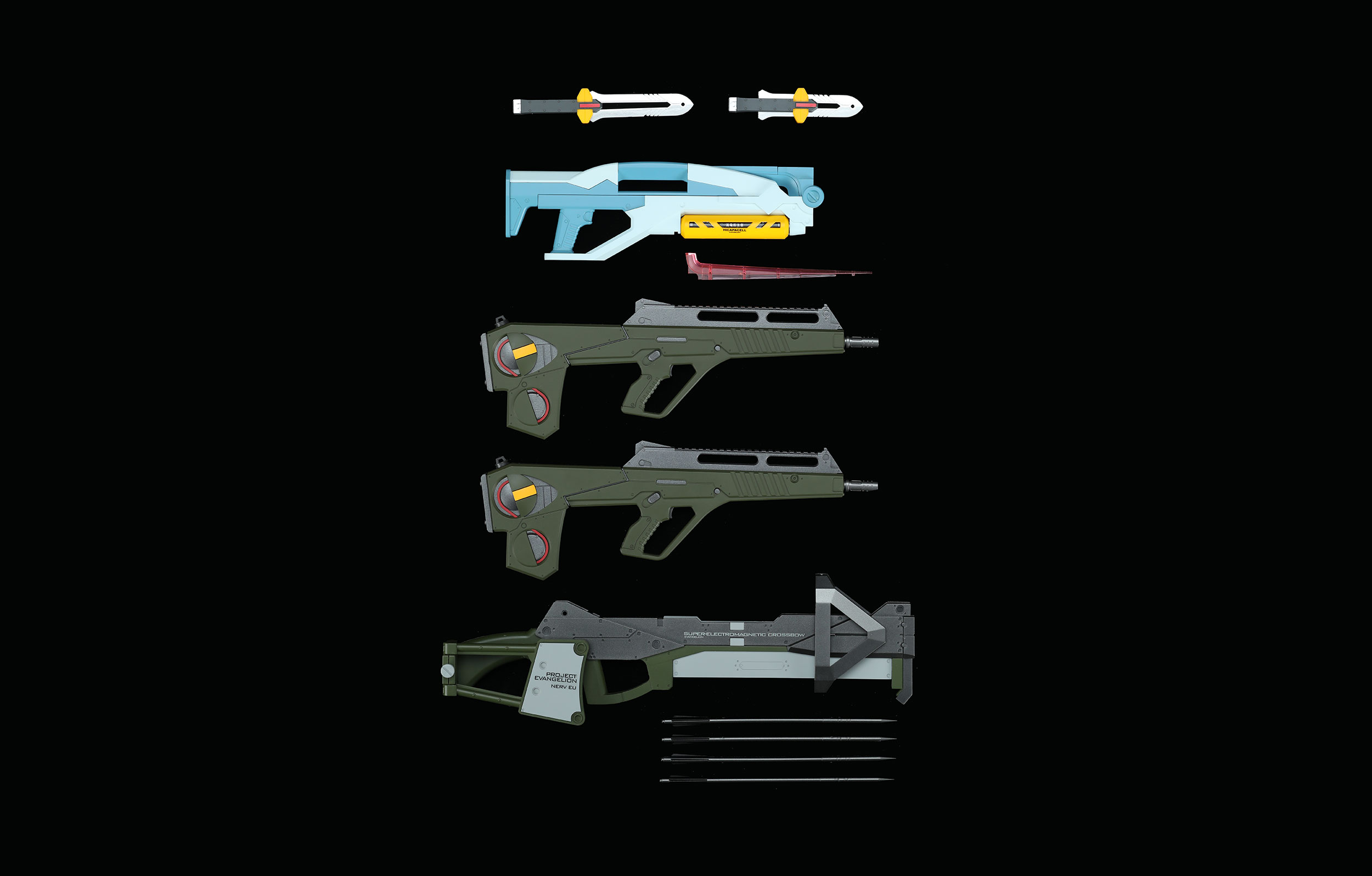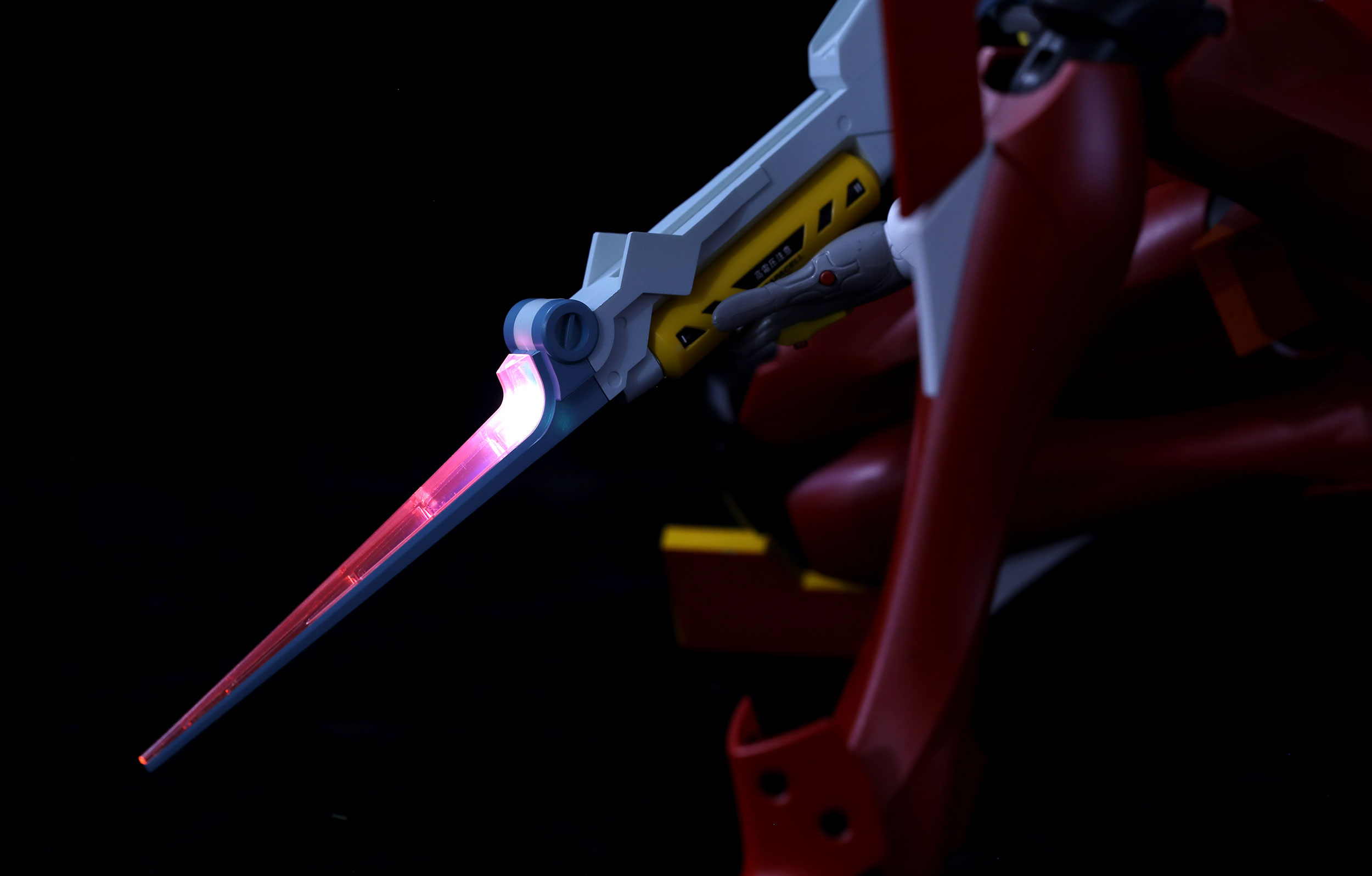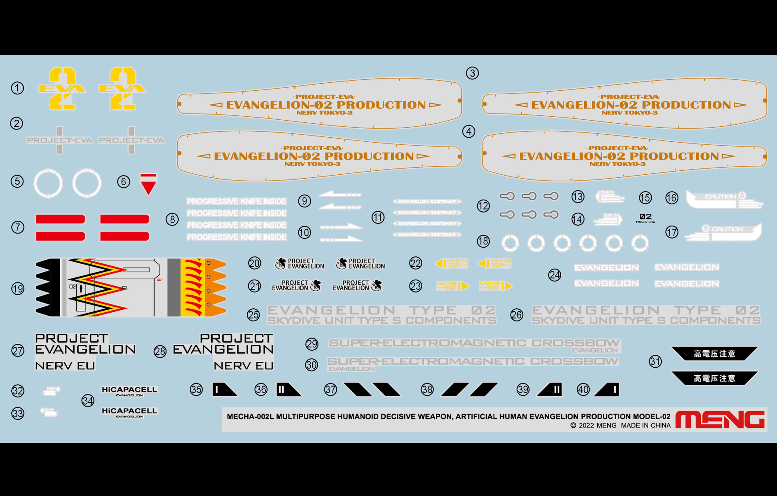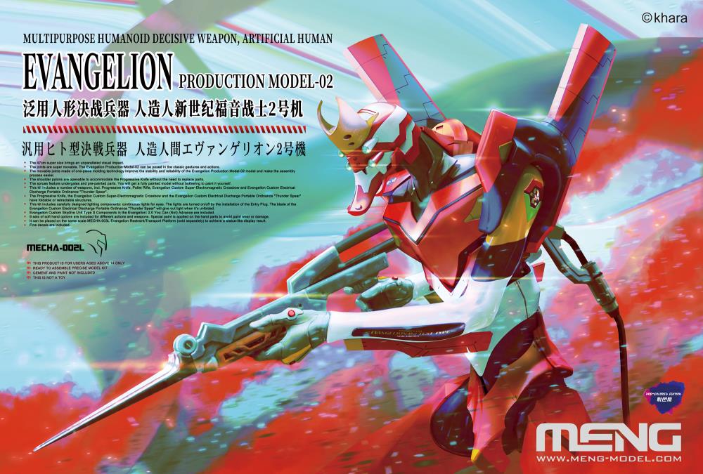 MECHA-002L Multipurpose Humanoid Decisive Weapon, Artificial Human Evangelion Production Model-02 is a large scale pre-painted model kit. This pre-colored edition kit features cement-free assembly and pre-painted parts. The movable joints made of one-piece molding technology improve the stability and reliability of the Evangelion Production Model-02 model. The joints are super movable. The Evangelion Production Model-02 can be posed in the classic gestures and actions. This kit includes carefully designed lighting components: continuous lights for eyes. The lights are turned on/off by the installation of the Entry Plug. This kit includes the Evangelion Custom Skydive Unit Type S Components in the Evangelion: 2.0 You Can (Not) Advance. The shoulder pylons are perfectly replicated to accommodate the Progressive Knives. You can transform and eject the Progressive Knife out without replacing any part. This kit includes various weapons, incl. two retractable Progressive Knives, one Evangelion Custom Electrical Discharge Portable Ordinance "Thunder Spear", two Pallet Rifles and one Evangelion Custom Super-Electromagnetic Crossbow which has a carefully designed lighting part. This kit also contains multi sets of soft hand options are included for different actions and weapons. Special paint is applied on the hand parts to avoid paint wear or damage. This kit includes fine decals.