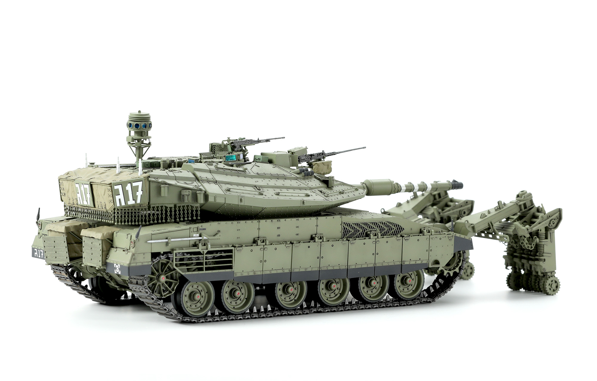 This MENG TS-049 1/35 Israel Main Battle Tank Merkava Mk.4/4 LIC w/Nochri-Kal Mine Roller System model kit is released on the 50th anniversary of the Merkava main battle tank family. This is another heavyweight product presented by MENG and Desert Eagle Publishing. This kit features movable suspension and workable tracks. The storage basket canvas cover is designed by digital sculpting. The one-piece ball and chain armor parts are realistic and easy to assemble. All crew hatches can be built in the open or closed position. Transparent parts are used for lights, observation windows and optical instruments. Fine PE parts are included. This kit includes a precision Droid active protection system and a movable Nochri-Kal mine roller system. It can be built as a Merkava Mk.4 or Merkava Mk.4 LIC. Two paint schemes are provided.