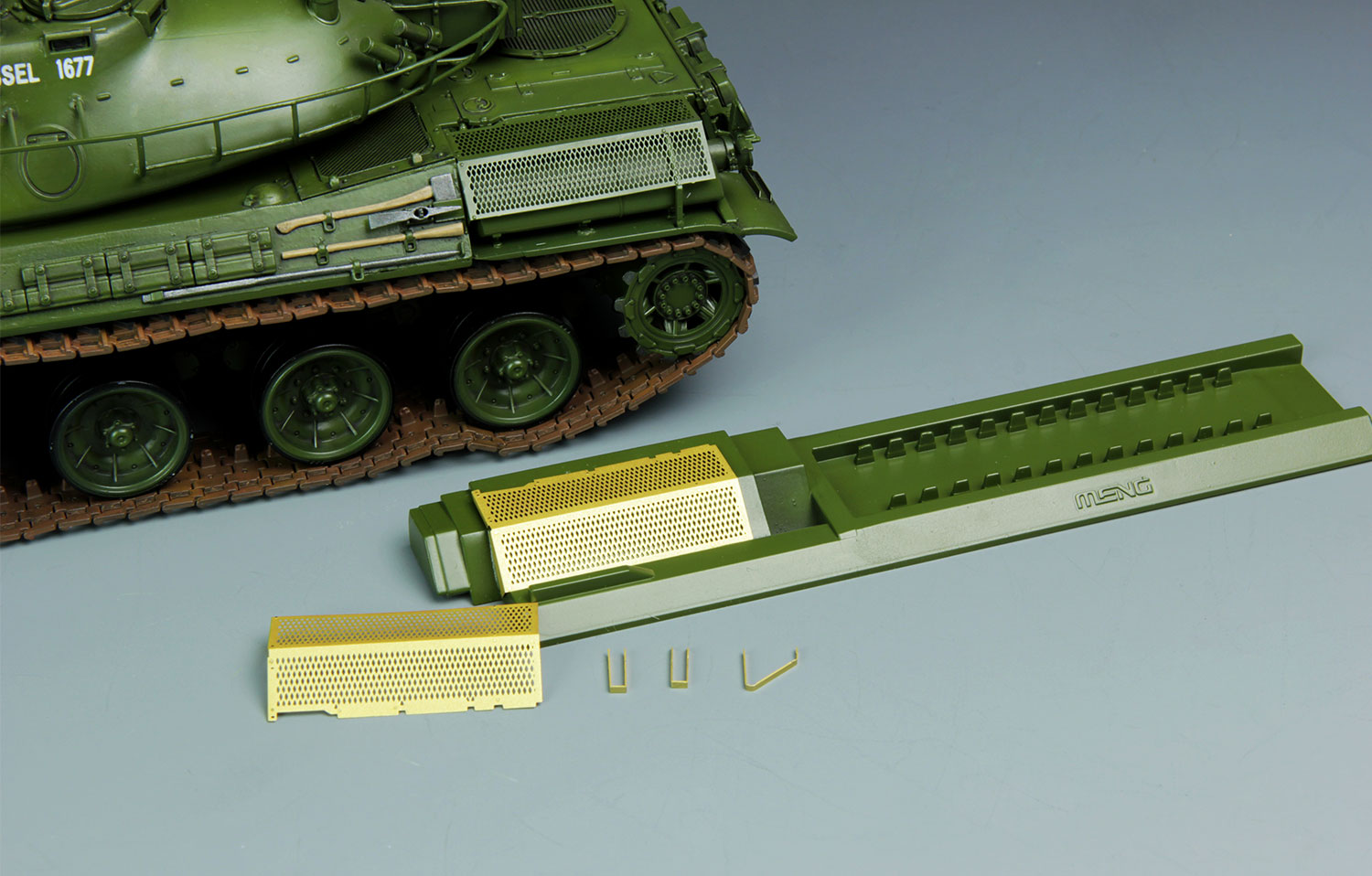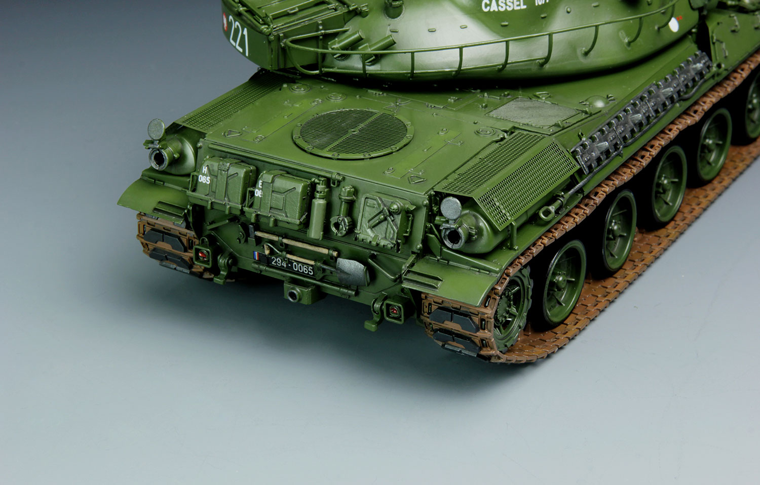 1/35 scale French AMX-30B MBT plastic model kit. 271mm in total length and 89mm in width. Casted turret shape is realistically reproduced on the model; the gun and 20mm autocannon can elevate independently; hatch on commander cupola can rotate in 360 degrees; realistic running gear parts on the chassis are movable; elastic torsion bar structure combined with movable hydraulic shock absorbers can realize the shock absorption action like the real vehicle; workable track links are easy to assemble. Two painting options are provide.