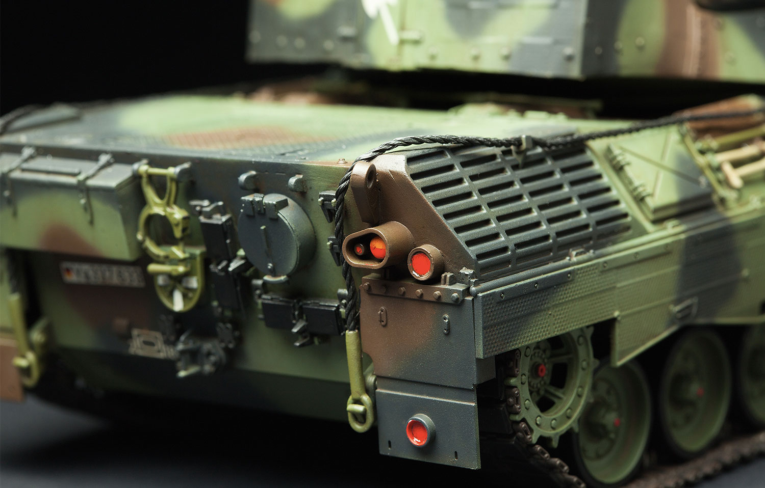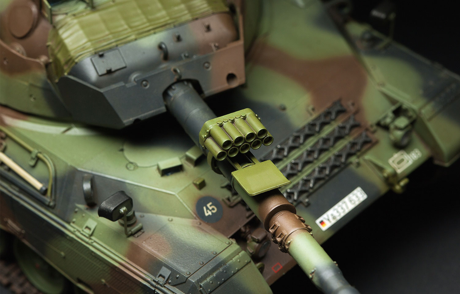 This 1/35 scale TS-015 German Main Battle Tank Leopard 1 A5 plastic model kit precisely presents the features of German tanks. TPE turret add-on armor is as realistic as replicated the real thing and all its mounting bosses are accurately reproduced; clear periscopes and lights are provided; hatches, including the ammunition loading port, can be built open or closed; holes on the side-skirts are realistically represented; cement-free workable double-pin tracks are easy to assemble; the workable tracks and movable suspension make the model more interesting; two precision PE frets of different thicknesses are provided for different details; three paint schemes are included.