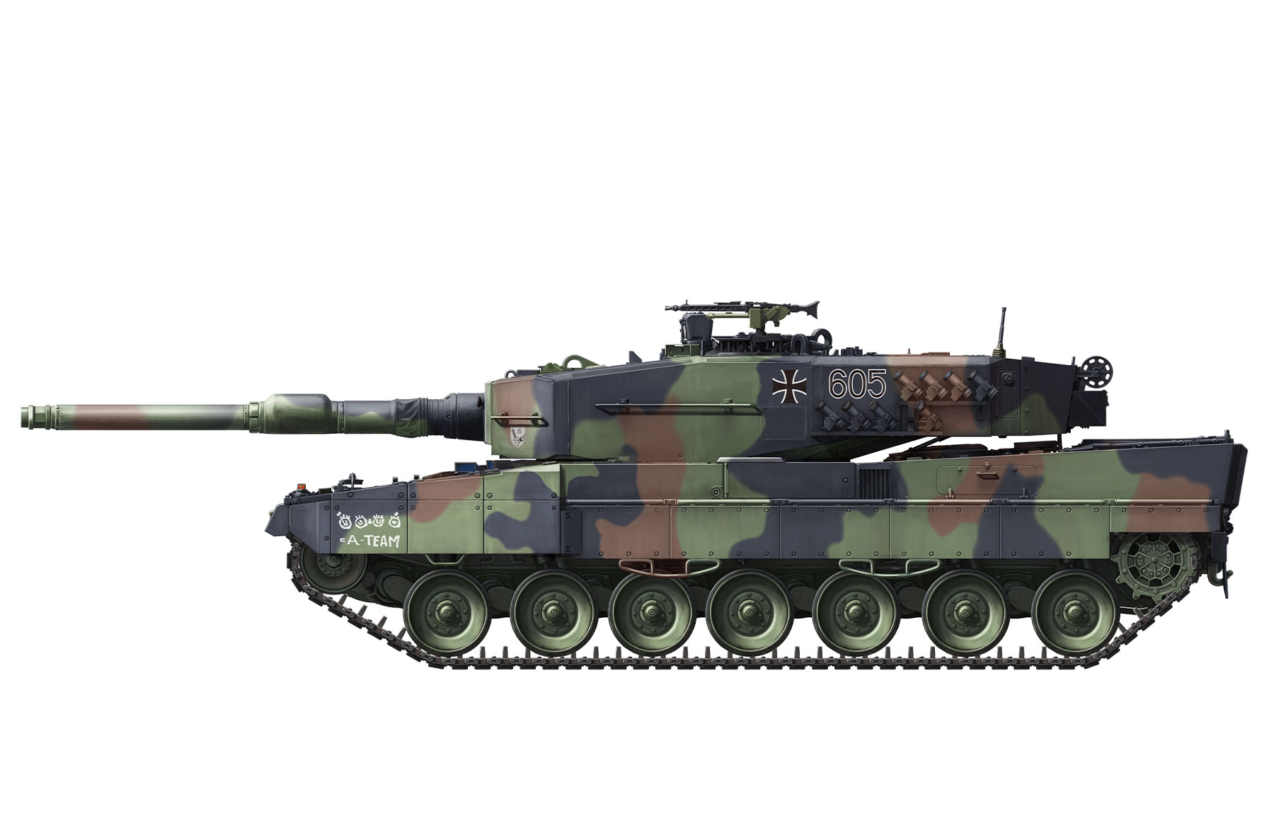 The combat weight of the Leopard 2 A4 MBT is 55t. It’s fitted with a Rheinmetall 120mm L/44 smoothbore gun and a digital fire control computer. It’s powered by a 1500hp MTU MB873 diesel engine. Its maximum speed is up to 72km/h.