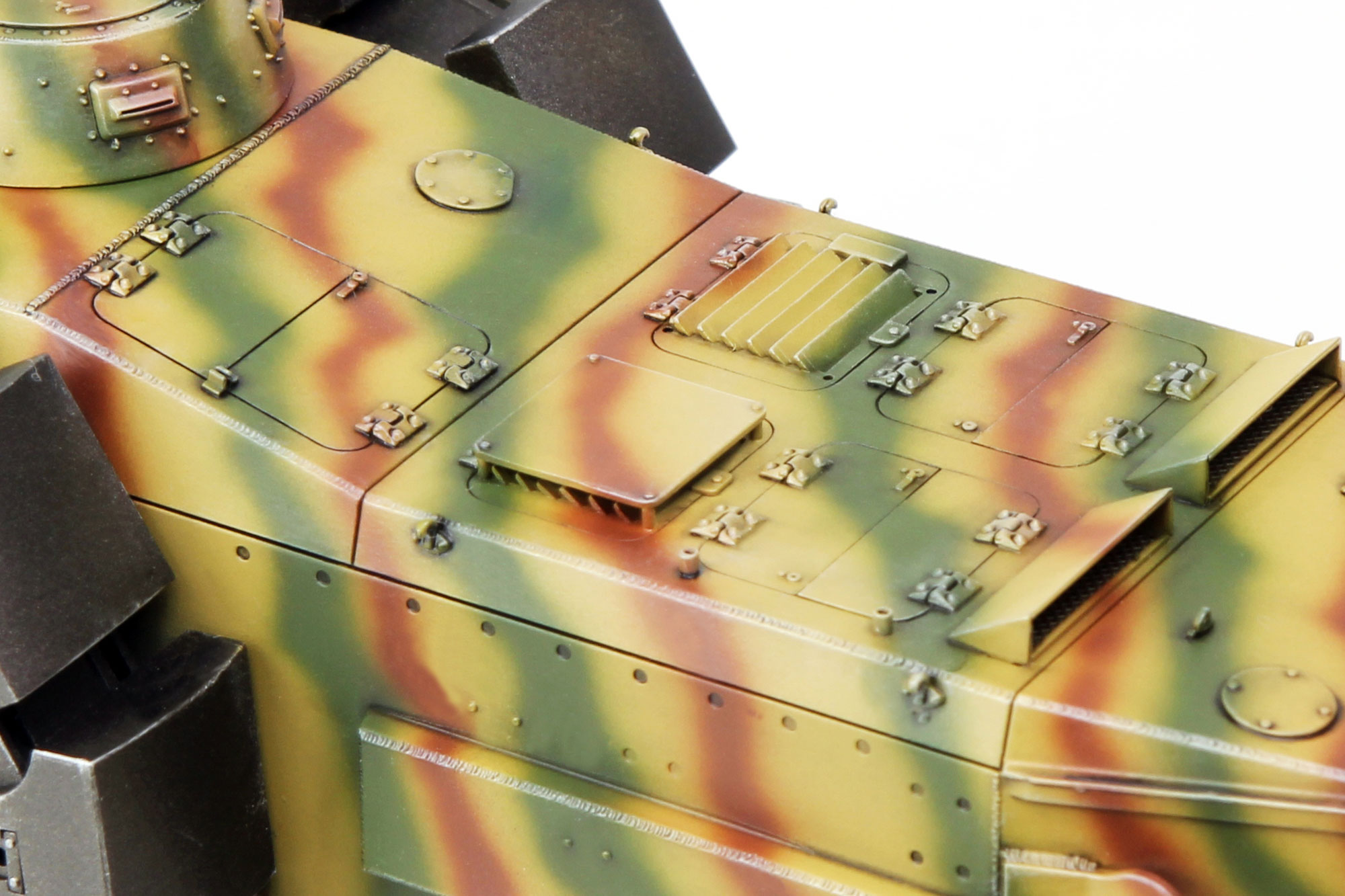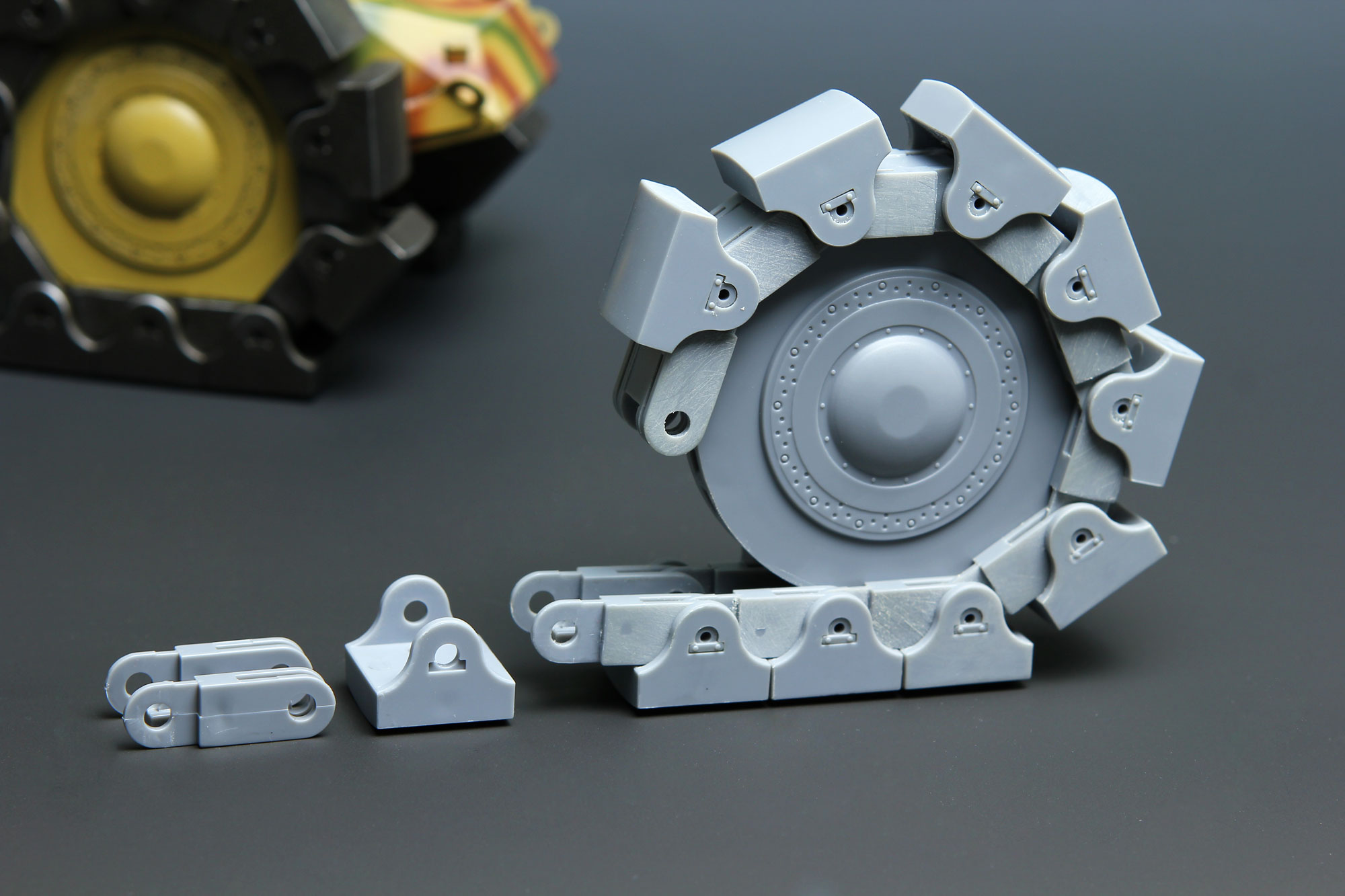 Highly percussive VsKfz 617 minesweeper kit in scale 1/35, its length, width and altitude are 188mm, 91.5mm and 81.5mm respectively. The shoes which have the metal blocks inside are included in the box. The three wheels can be moved and turned freely. Separate molding links reproduce the appearance of real vehicle precisely so as to make the wheel-making easier.