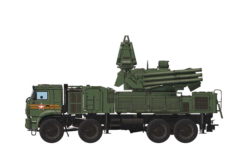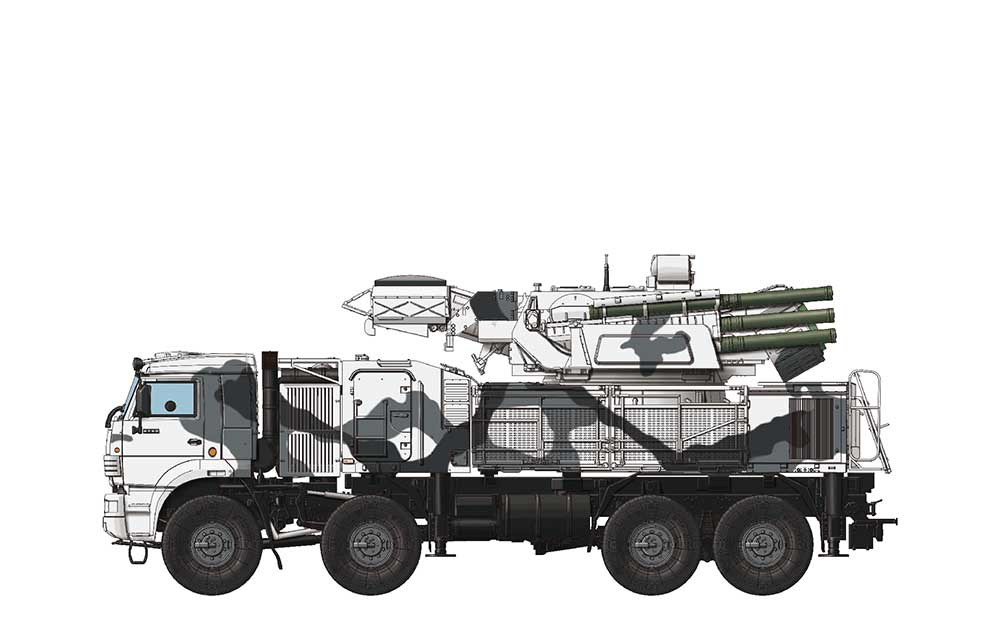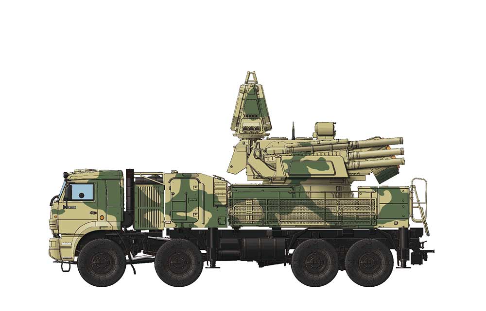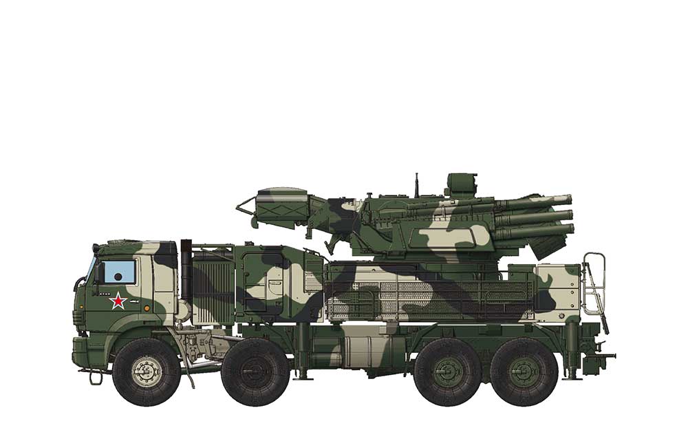 The 96K6 Pantsir air defense system successfully developed in 1994 is a further development of Tunguska and has improved weapon capacity and maneuverability. It’s a combined missile and anti-aircraft gun system against low flying and ultra low flying threats. The main version 96K6 Pantsir S-1, NATO reporting name SA-22 Greyhound, has been deployed since 2008. This weapon system includes two 2A38M 30 mm AA guns and 12 57E6 series surface-to-air missiles. The whole weapon system is based on a KAMAZ-6560 8x8 cross-country truck. The Pantsir system has been deployed in the Russian Army for years and has outstanding performance in some local conflicts.