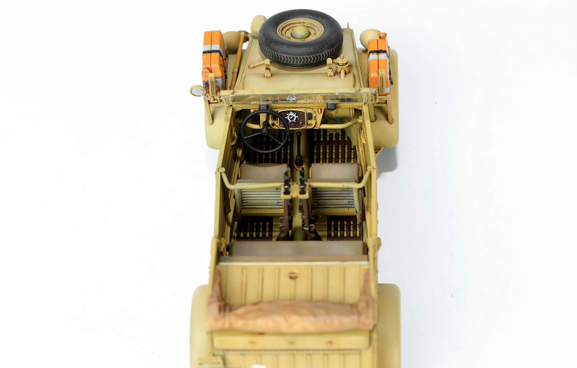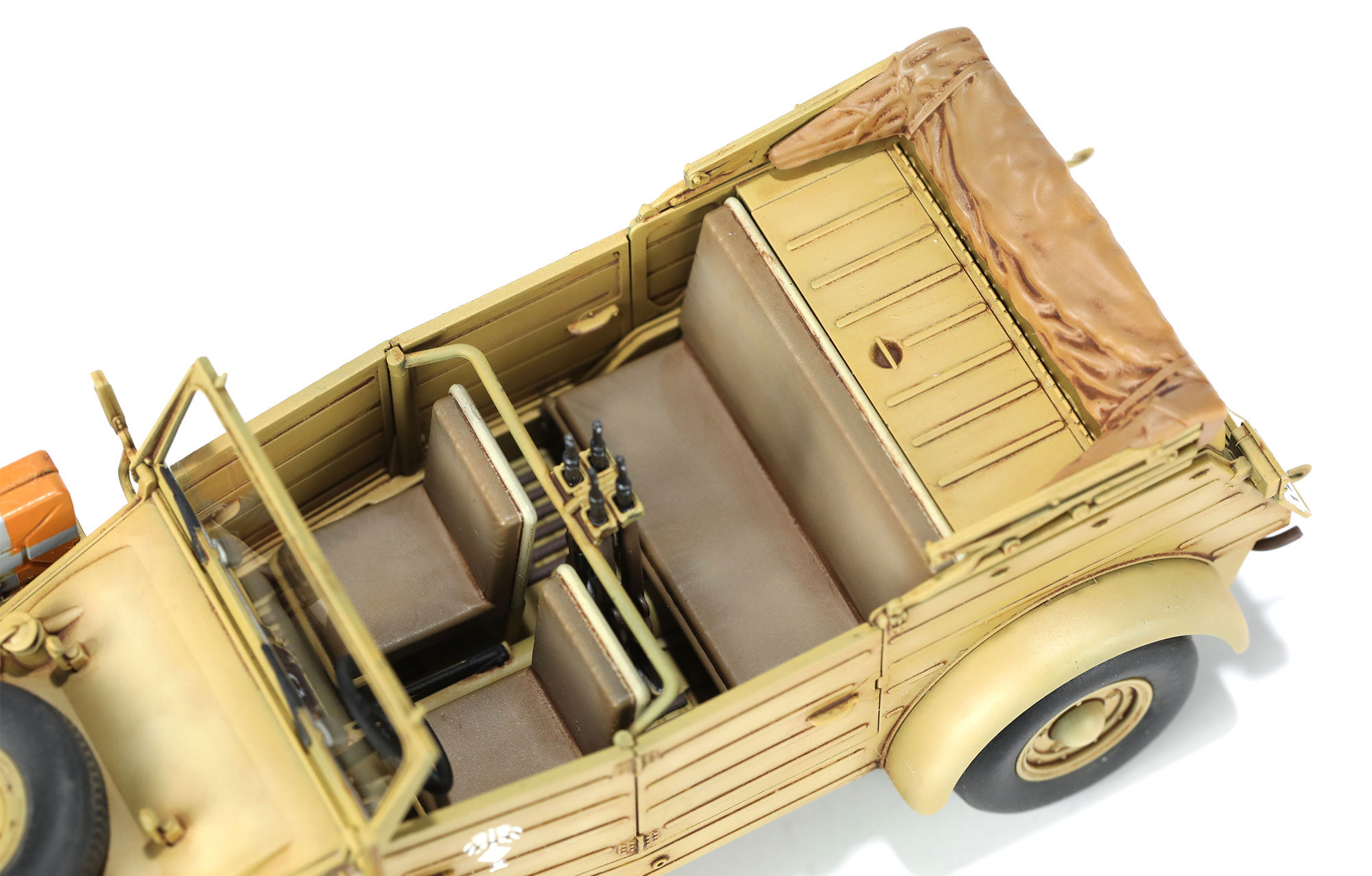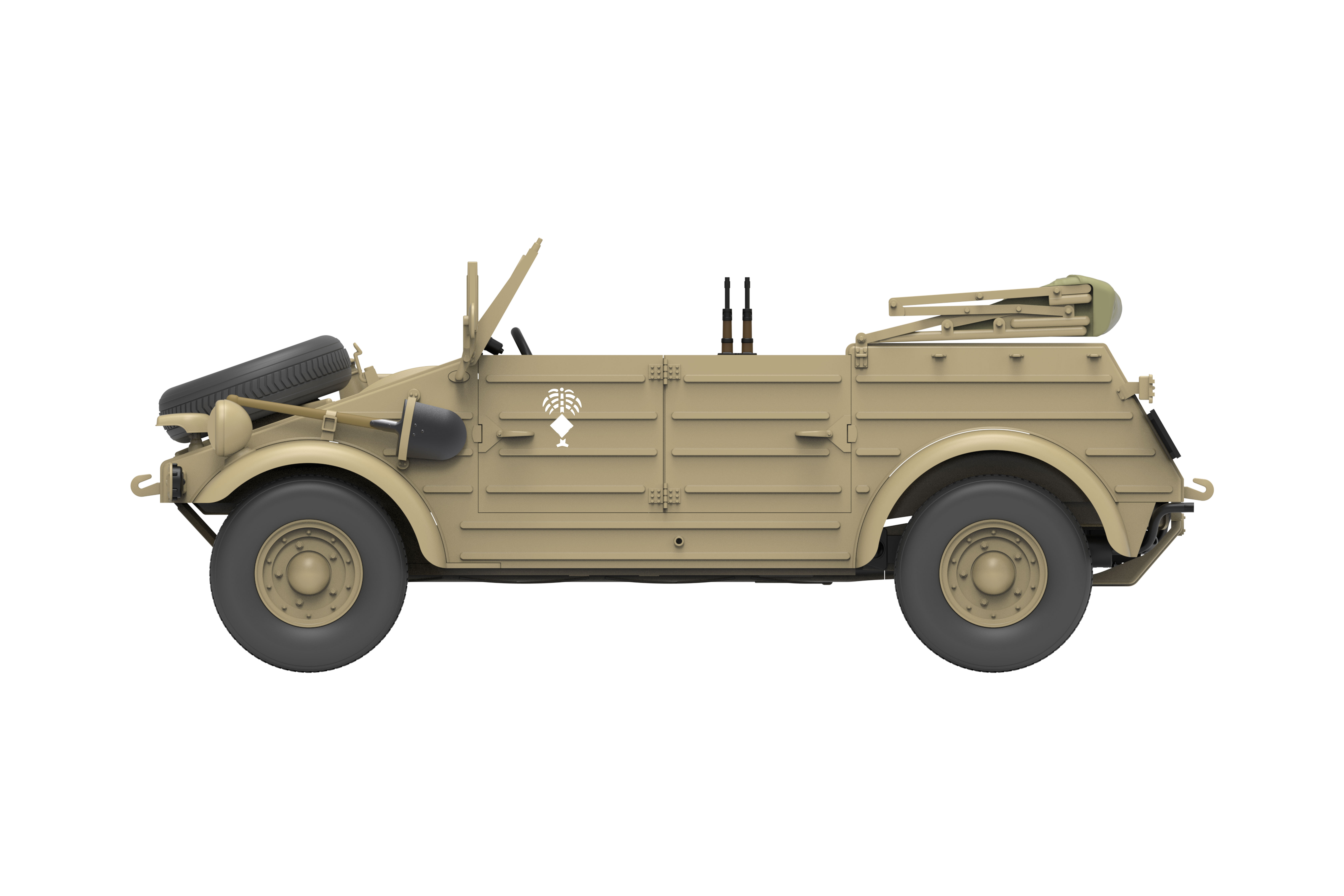 The Pkw.K1 Kübelwagen Type 82 was a crucial vehicle widely used by the German military during World War II. It was favored by German officers and soldiers for its simple structure, ease of maintenance, low fuel consumption, and excellent off-road capabilities. Because of its boxy appearance resembling a square barrel, it earned the nickname Bucket Car. The Type 82's outstanding performance on the battlefield made it one of the symbols of the German military during the war. In the harsh desert environment of North Africa, the Type 82 won the trust of Rommel's Afrika Korps due to its exceptional capabilities. To adapt to the complex battlefield conditions in the desert, the Wolfsburg factory specially equipped the Type 82 vehicles used in North Africa with balloon tires.