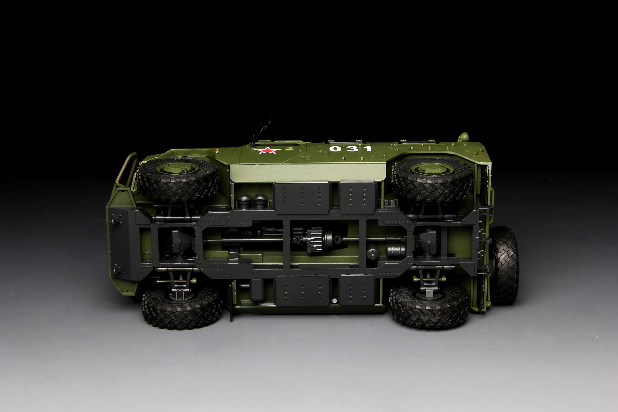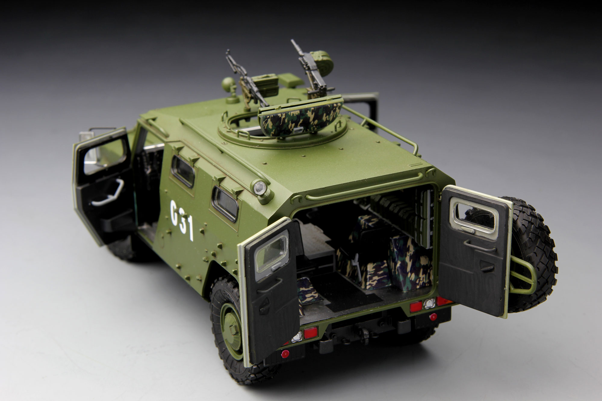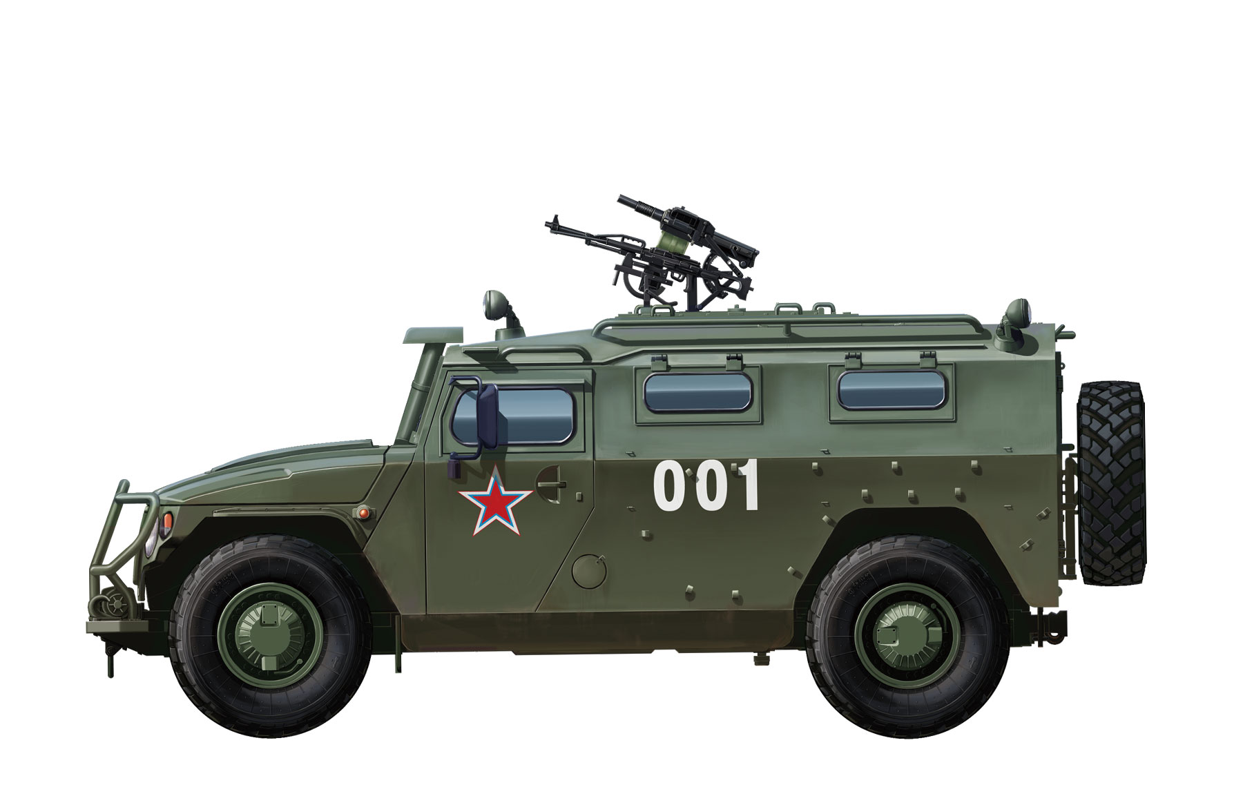 GAZ-233014 is the military variant of GAZ-2330 “Tiger” high-mobility vehicles which resemble the U.S."Humvee" and are therefore called the “Russian Humvee”. Entered military service in 2007, the “Tiger”is capable of achieving an off-road speed up to 120-140km/h thanks to its high mobility design. A crewof six includes driver and co-driver plus 4 Special Forces personnel. Armament consists of roof ring mounted AGS-17 30mm automatic grenade launcher and “Pecheneg” 7.62mm MG which can be simultaneously operated by two crew members through the open hatch. The cabin can also host a large storage of ammunition and RPG launchers.