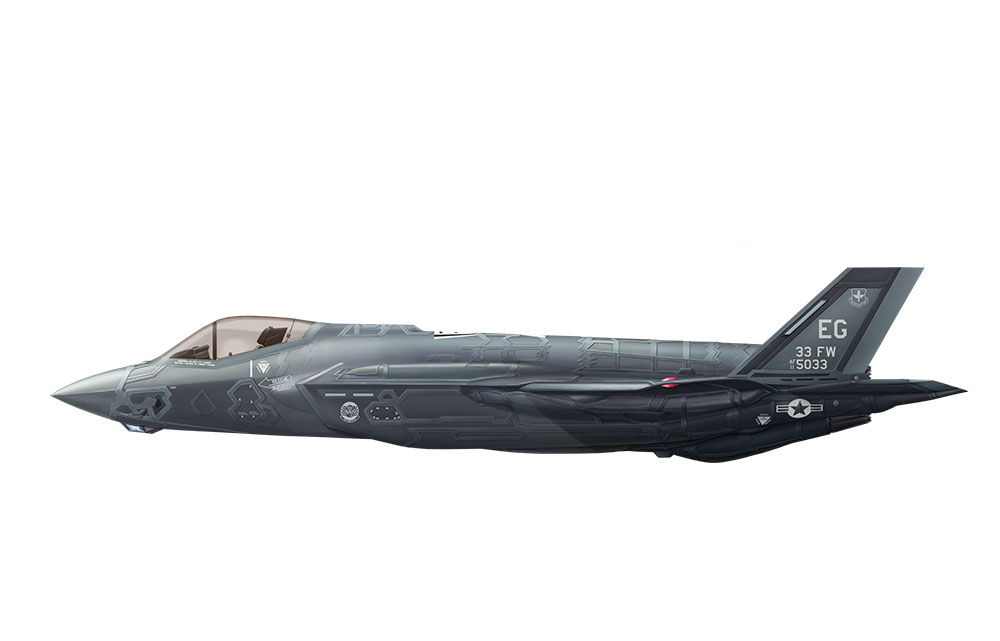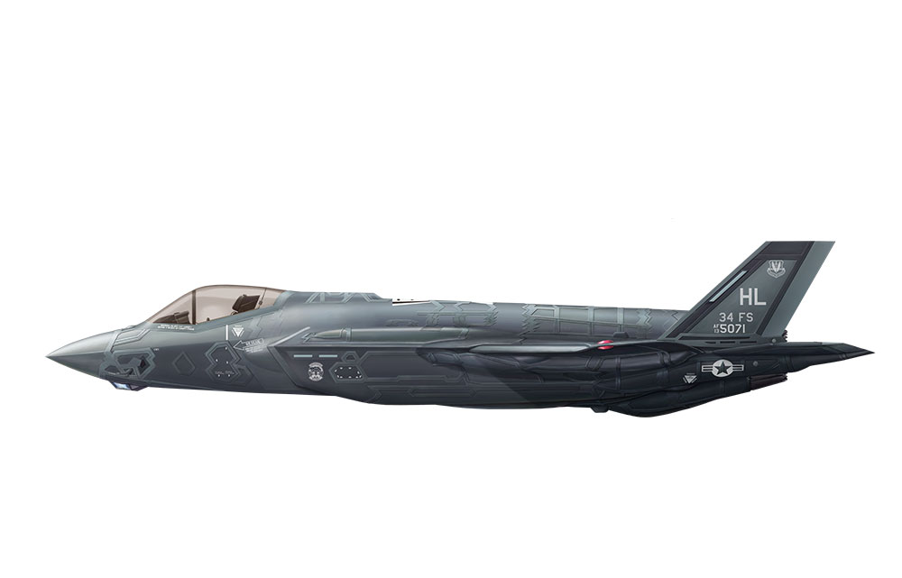 This Lockheed Martin F-35A Lightning II fighter plastic model kit features accurate profile, complete weapons bay and air inlet ducts, lots of surface details and various store options. Elevator surfaces can be installed in different positions.