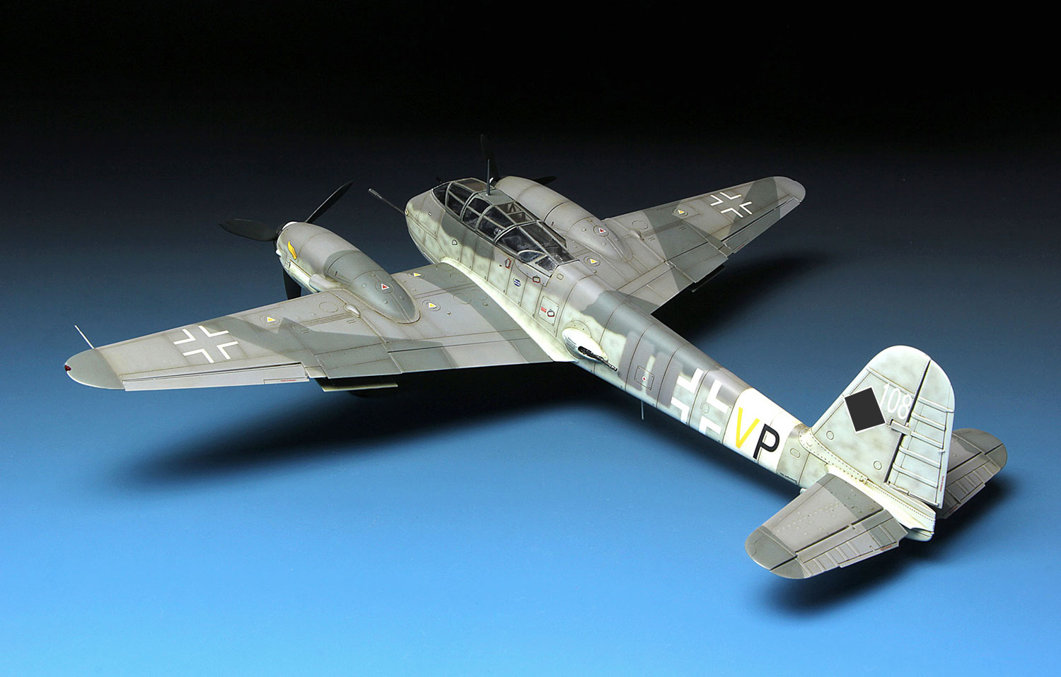 1/48 Messerschmitt Me410B-2/U4 heavy fighter plastic model kit,Length:278mm, Wingspan: 340mm. Beautiful lines of this aircraft are reproduced perfectly on the model ;Detailed cockpit;An accurate reproduction of the engine;Gun turret in the center of the fuselage is movable as the real aircraft;Angle of flap, aileron, elevator, rudder can be selected;Engine radiator can be open or closed. Two painting options provided.