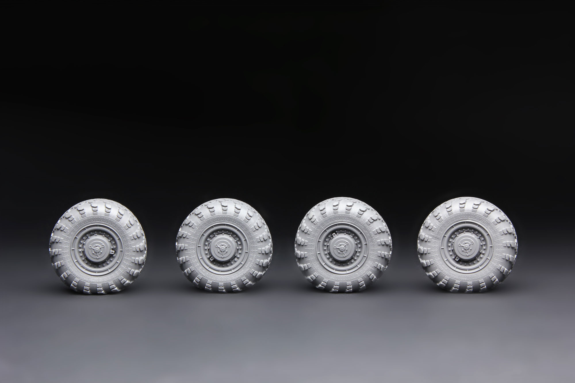 This resin wheel set realistically replicates the weighted wheels on real vehicles. Wheel hubs are detailed and delicate. The rugged tire tread is excellent. It will definitely make all vehicles with MAZ-543M chassis more eye-catching.